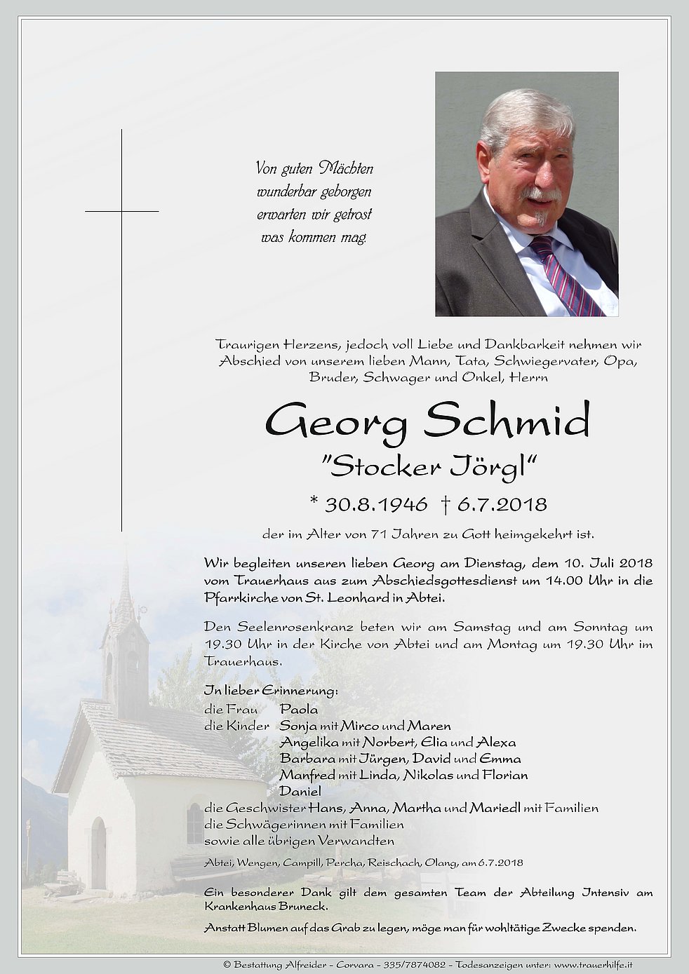 Wir begleiten unseren lieben Georg am Dienstag, dem 10. Iuli 2018 vom Trauerhaus aus zum Abschiedsgottesdienst um 14.00 Uhr in die Pfarrkirche von St. Leonhard in Abtei.
