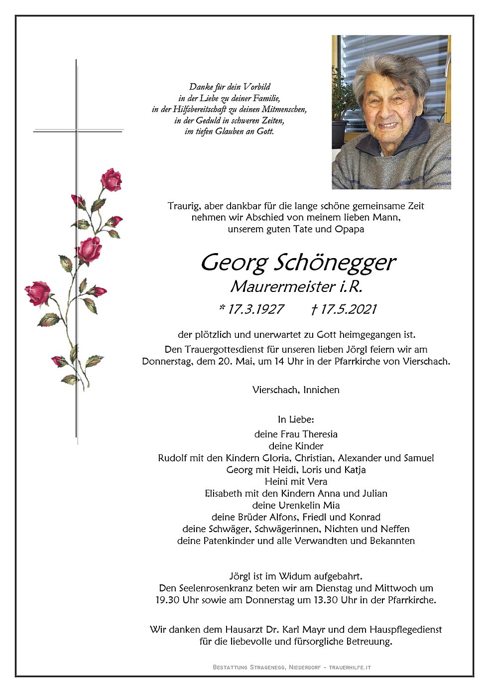 Den Trauergottesdienst für unseren lieben Jörgl feiern wir am Donnerstag, dem 20. Mai, um 14 Uhr in der Pfarrkirche von Vierschach.