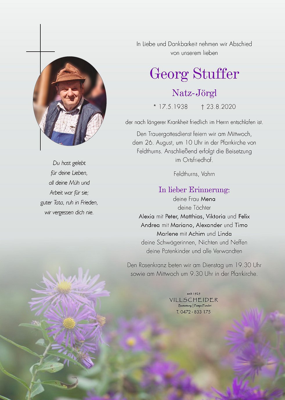 Begräbnisgottesdienst: 24.08. - 10:00 Uhr Feldthurns