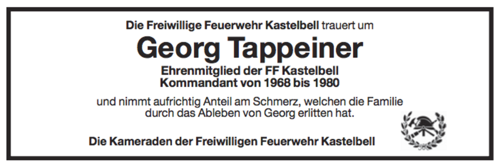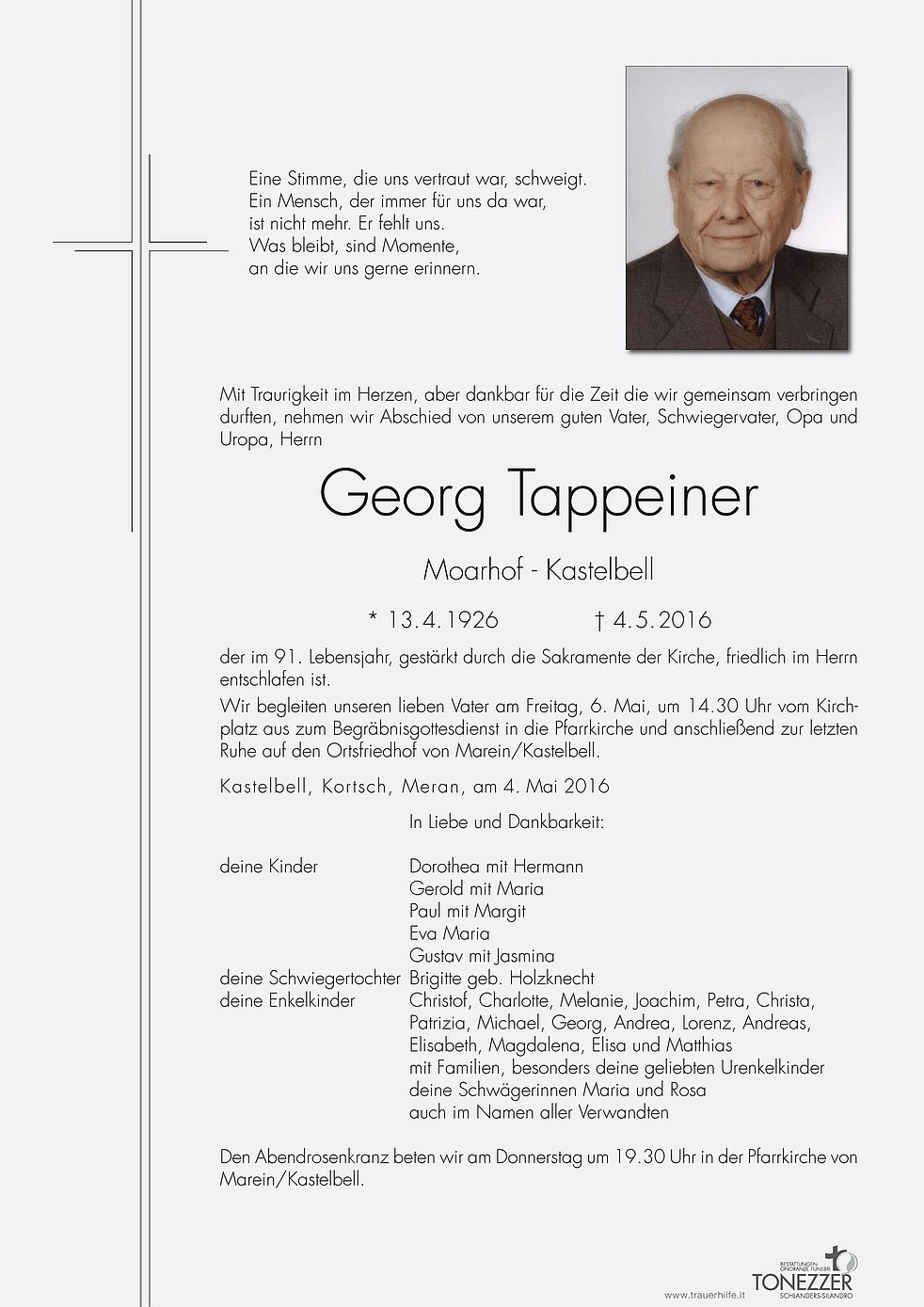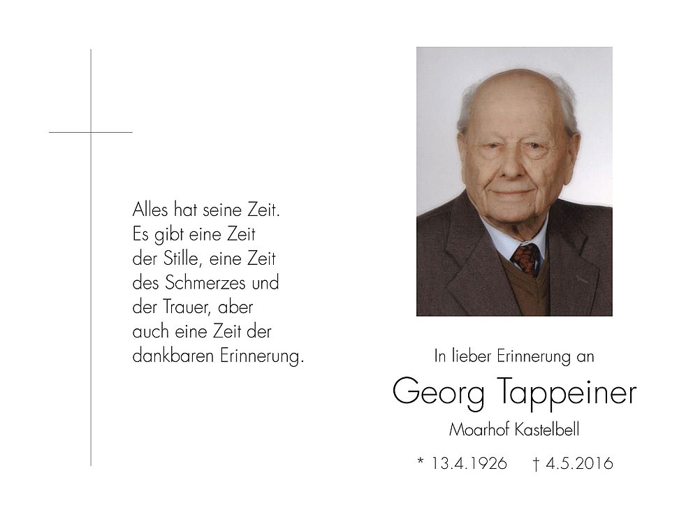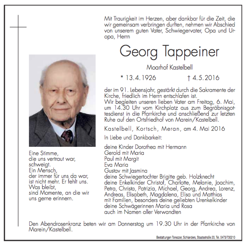 Wir begleiten unseren lieben Vater am Freitag, 6. Mai, um 14.30 Uhr vom Kirchplatz aus zum Begräbnisgottesdienst in die Pfarrkirche und anschließend zur letzten Ruhe auf den Ortsfriedhof von Marein/Kastelbell.
