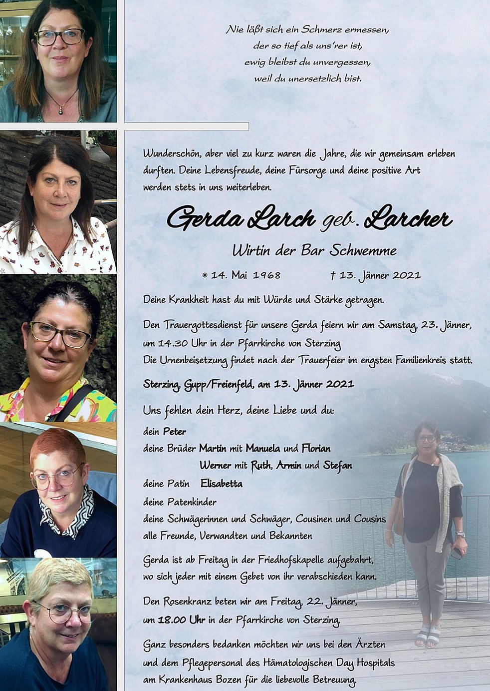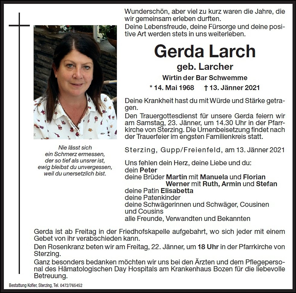 Den Trauergottesdienst für unsere Gerda feiern wir am Samstag, 23. Jänner, um 14.30 Uhr in der Pfarrkirche von Sterzing.
