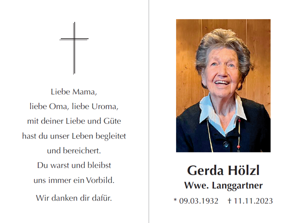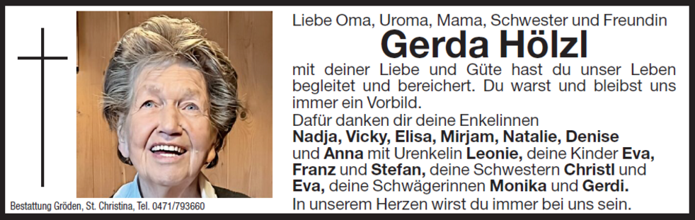 Gemeinsam begleiten wir Gerda am Dienstag, dem 14. November, um 14.15 Uhr vom Altersheim San Durich ausgehend, zum Abschiedsgottesdienst um 14.30 Uhr in die Pfarrkirche von St. Ulrich, wo auch die Verabschiedung stattfindet.