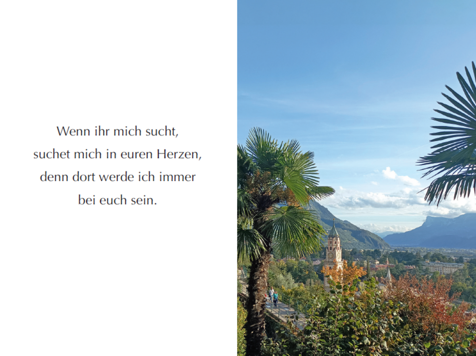 Anstelle von Blumen bitten wir um Spenden für den Vinzenzverein (IBAN: IT29O0805623120000302055180).