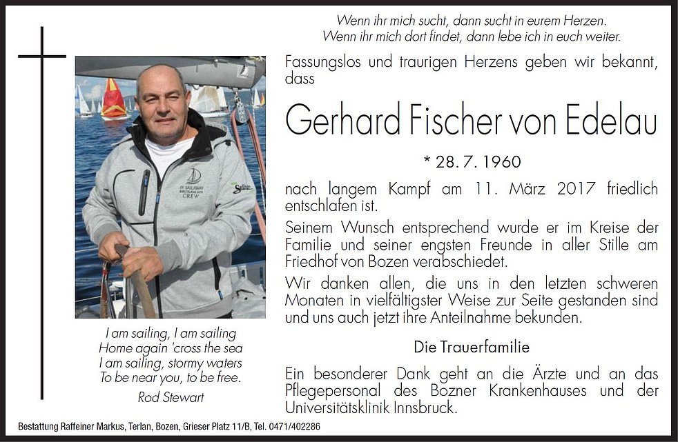 Seinem Wunsch entsprechend wurde er im Kreise der Familie und seiner engsten Freunde in aller Stille am Friedhof von Bozen verabschiedet.