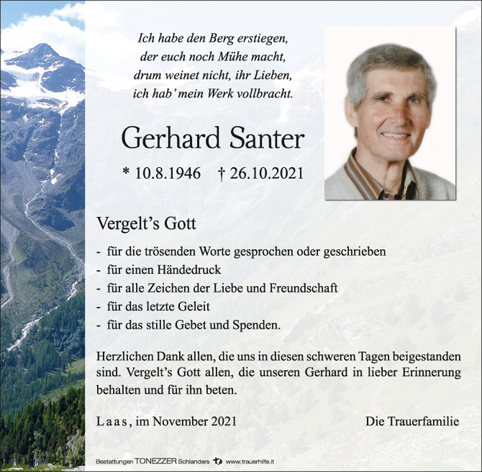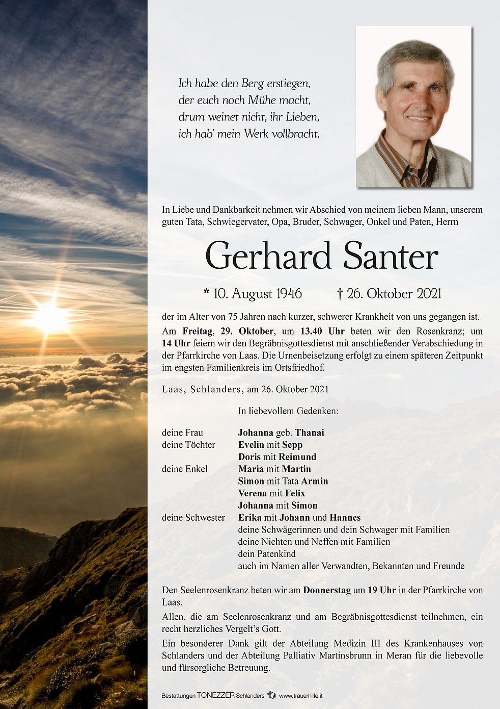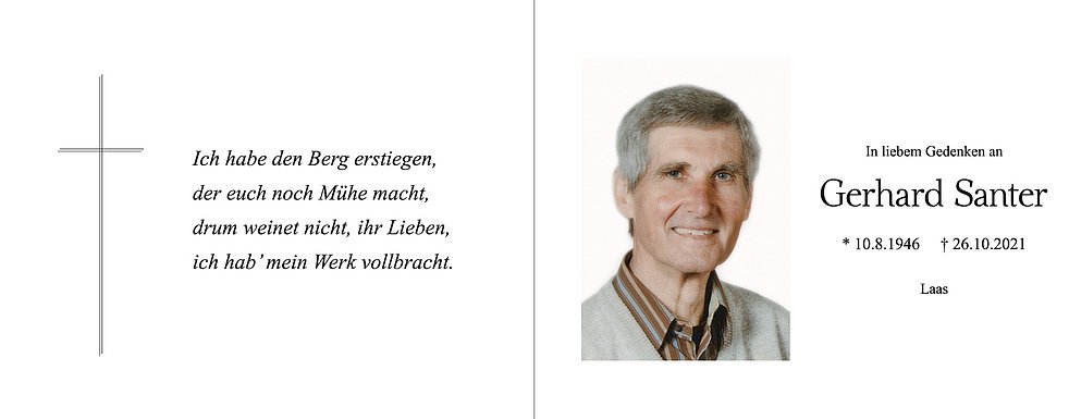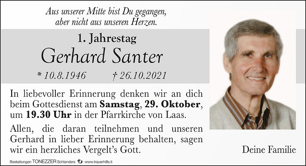 Am Freitag, 29. Oktober, um 13.40 Uhr beten wir den Rosenkranz; um 14 Uhr feiern wir den Begräbnisgottesdienst mit anschließender Verabschiedung in der Pfarrkirche von Laas.