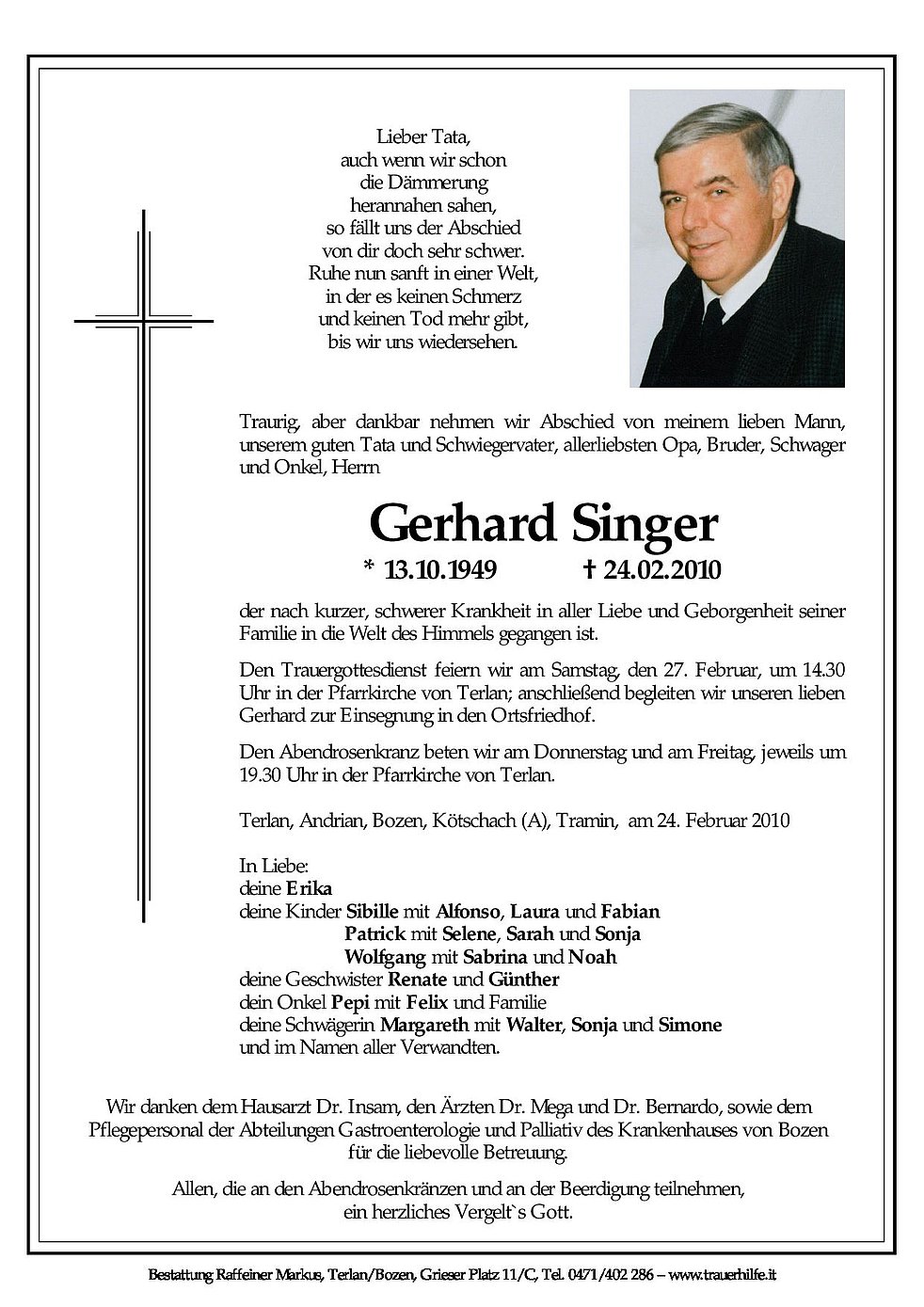 Den Trauergottesdienst feiern wir am Samstag, dem 27. Februar, um 14.30 Uhr in der Pfarrkirche von Terlan; anschließend begleiten wir unseren lieben Gerhard zur Einsegnung in den Ortsfriedhof.