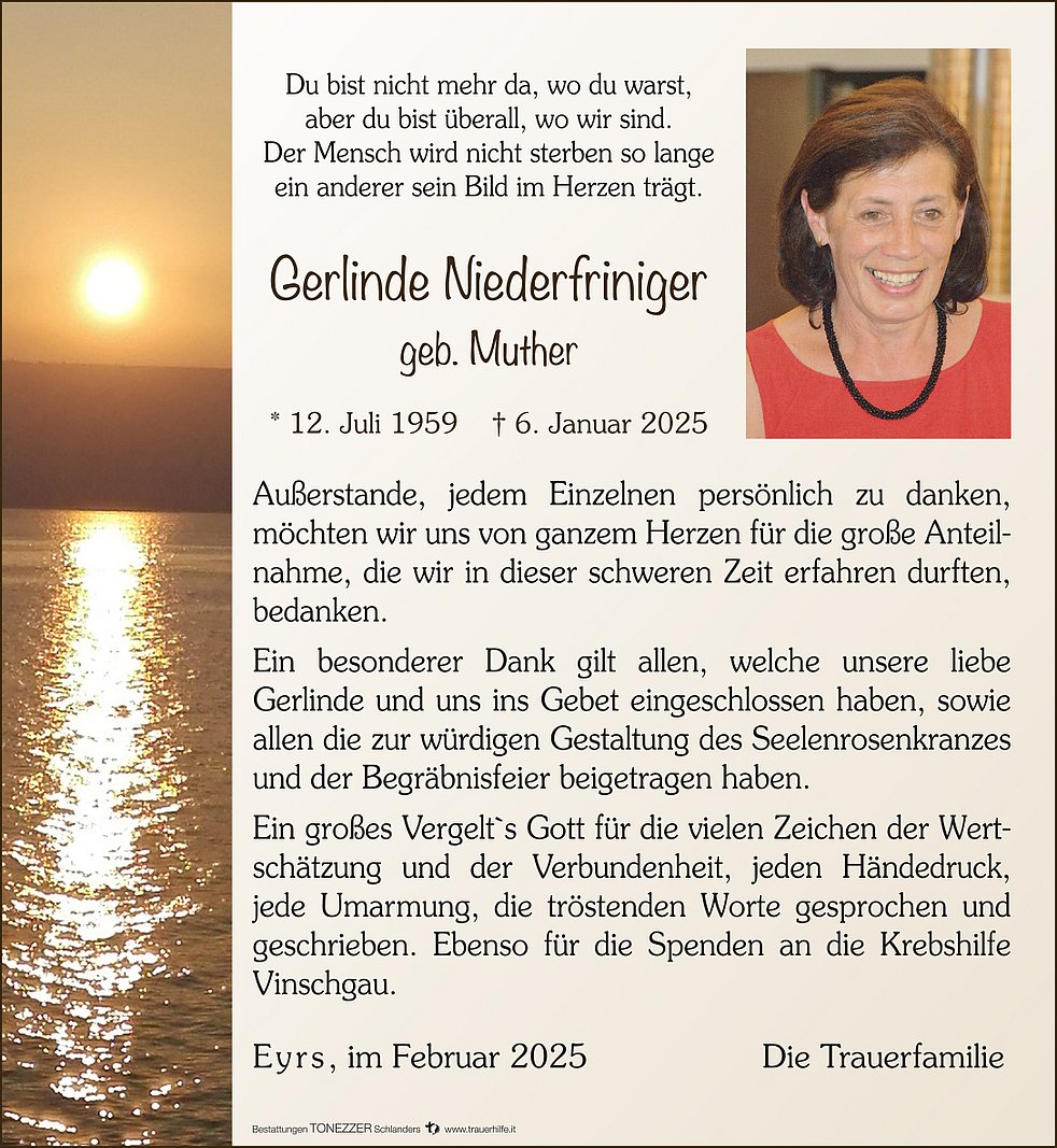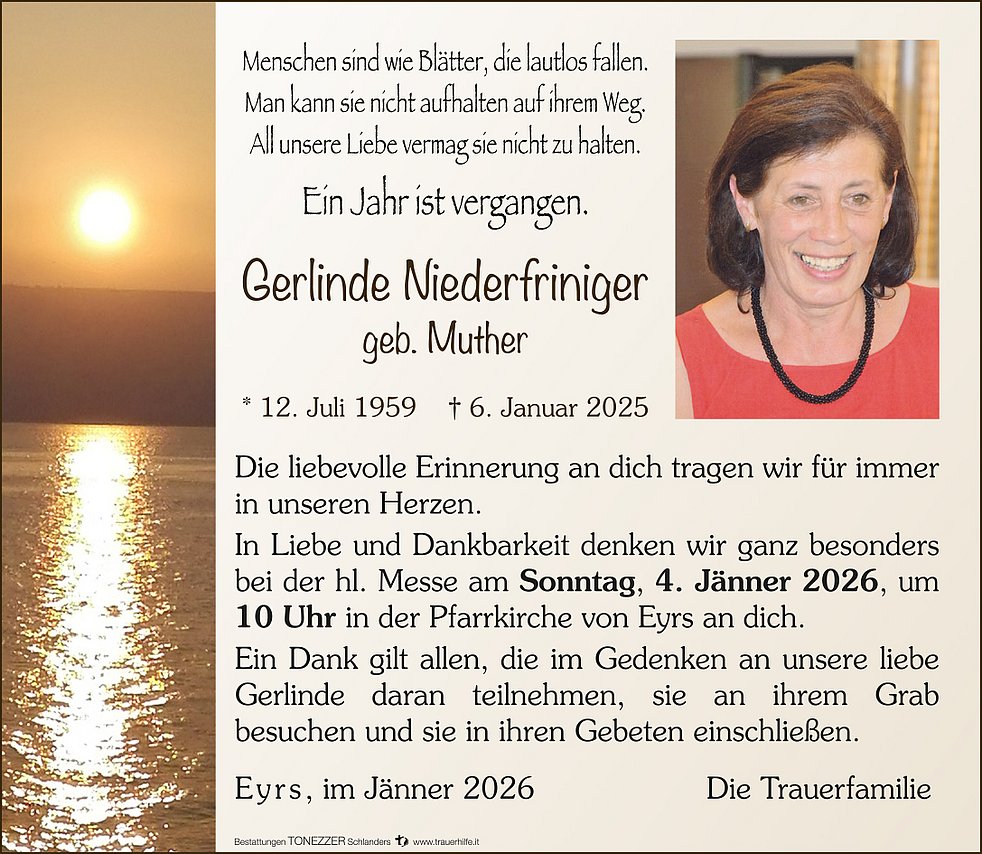 Am Mittwoch, 8. Jänner, um 13.30 Uhr beten wir den Rosenkranz; um 14 Uhr feiern wir den Begräbnisgottesdienst in der Pfarrkirche von Eyrs und anschließend begleiten wir unsere liebe Gerlinde zur letzten Ruhe auf den Ortsfriedhof.