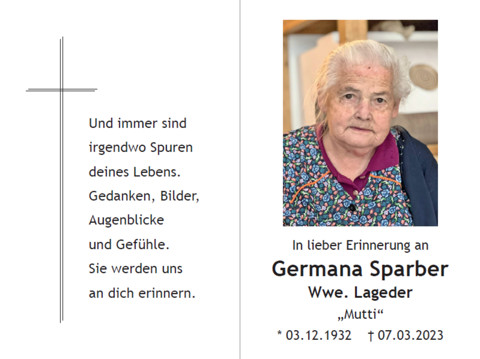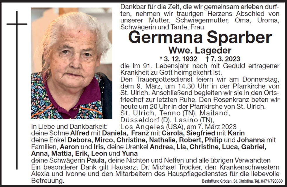 Den Trauergottesdienst feiern wir am Donnerstag, dem 09. März, um 14.30 Uhr in der Pfarrkirche von St. Ulrich. Anschließend begleiten wir sie in den Ortsfriedhof zur letzten Ruhe.