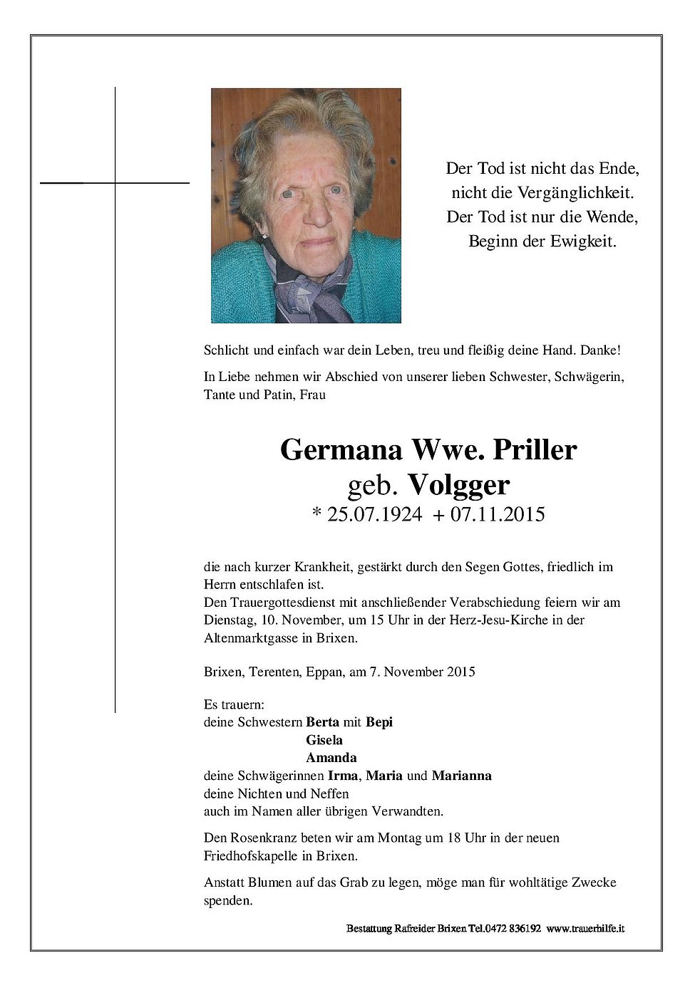 Wir möchten dem Hausarzt Dr. Mussner und dem Pflegepersonal des Pflegeheimes Haus Eiseck in Klausen für die liebevolle Betreuung herzlich danken.