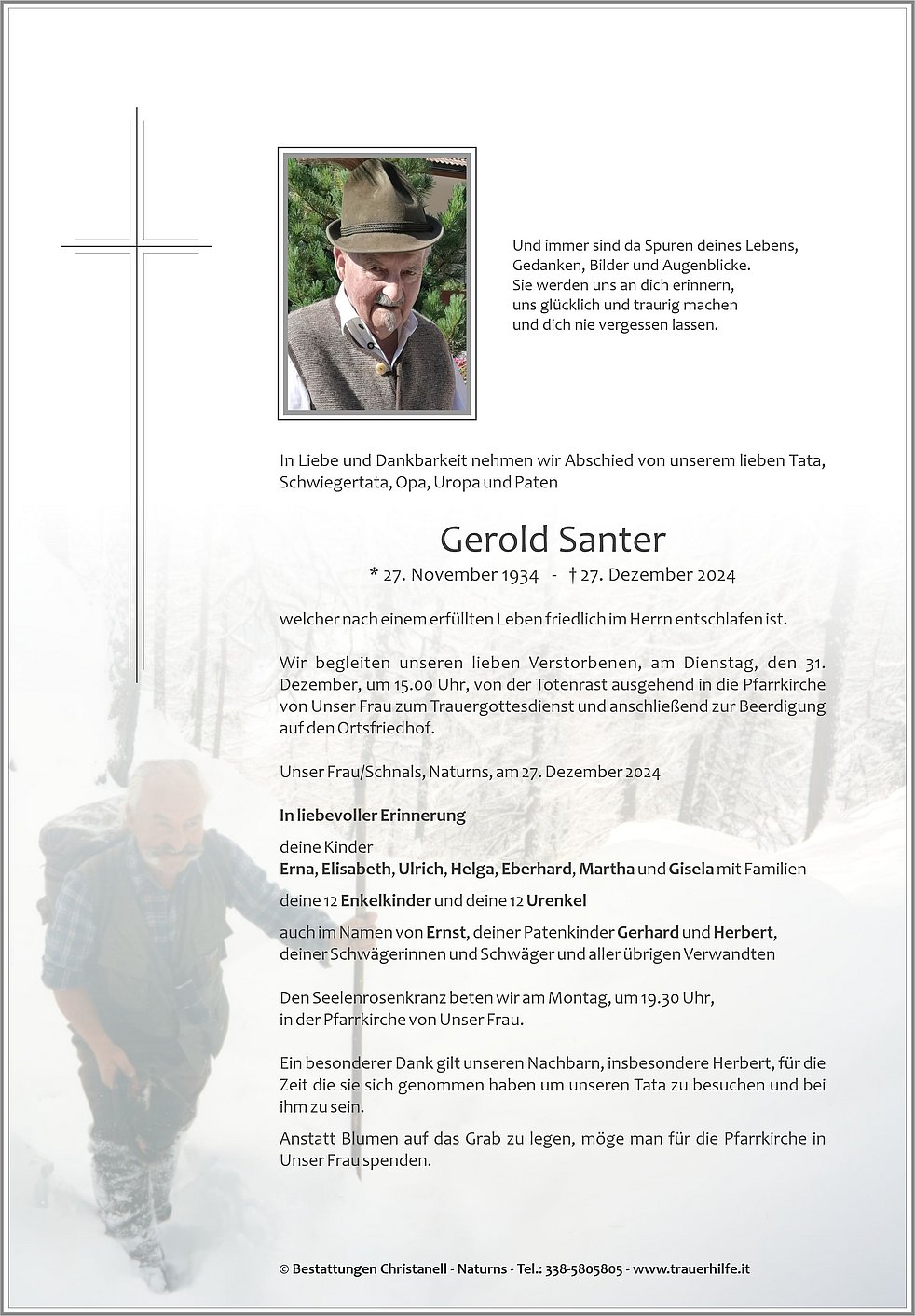 Wir begleiten unseren lieben Verstorbenen, am Dienstag, den 31. Dezember, um 15.00 Uhr, von der Totenrast ausgehend in die Pfarrkirche von Unser Frau zum Trauergottesdienst und anschließend zur Beerdigung auf den Ortsfriedhof.