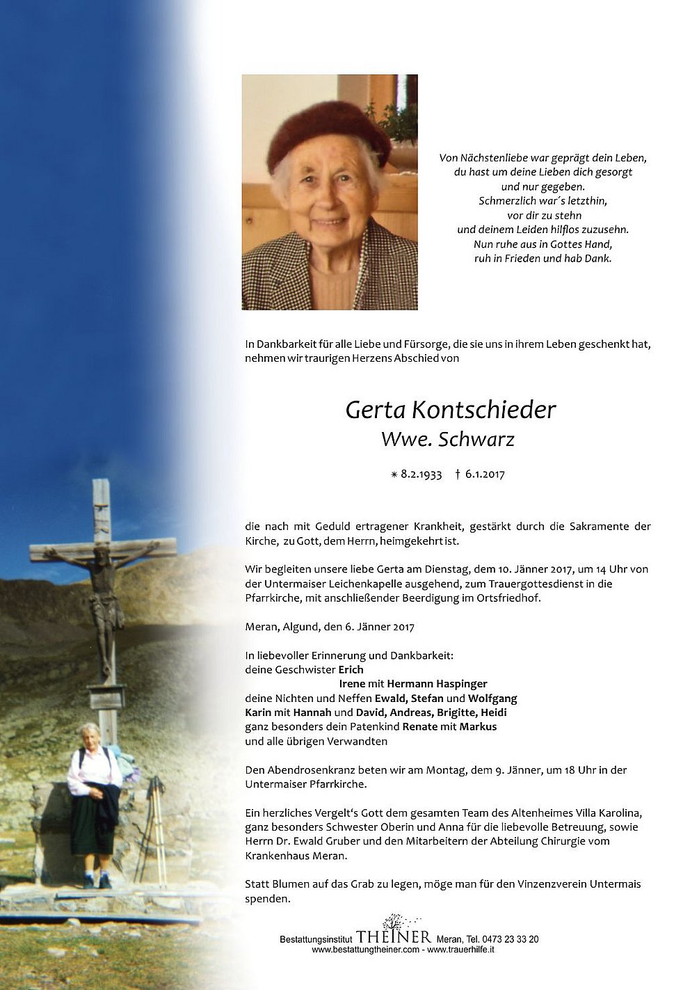 Wir begleiten unsere liebe Gerta am Dienstag, dem 10. Jänner 2017, um 14 Uhr von der Untermaiser Leichenkapelle ausgehend, zum Trauergottesdienst in die Pfarrkirche, mit anschließender Beerdigung im Ortsfriedhof.
