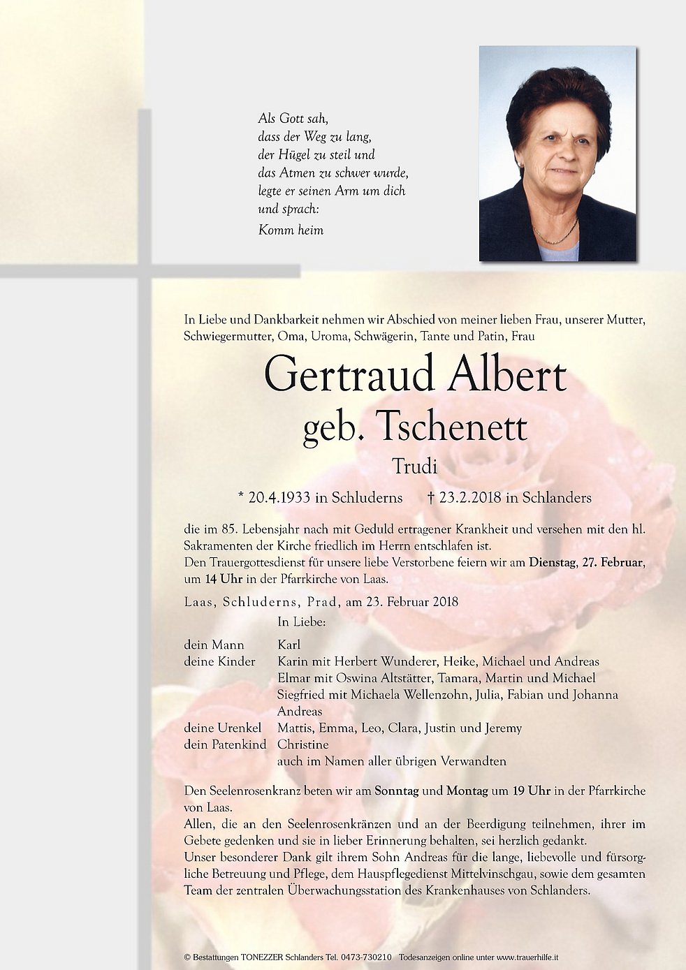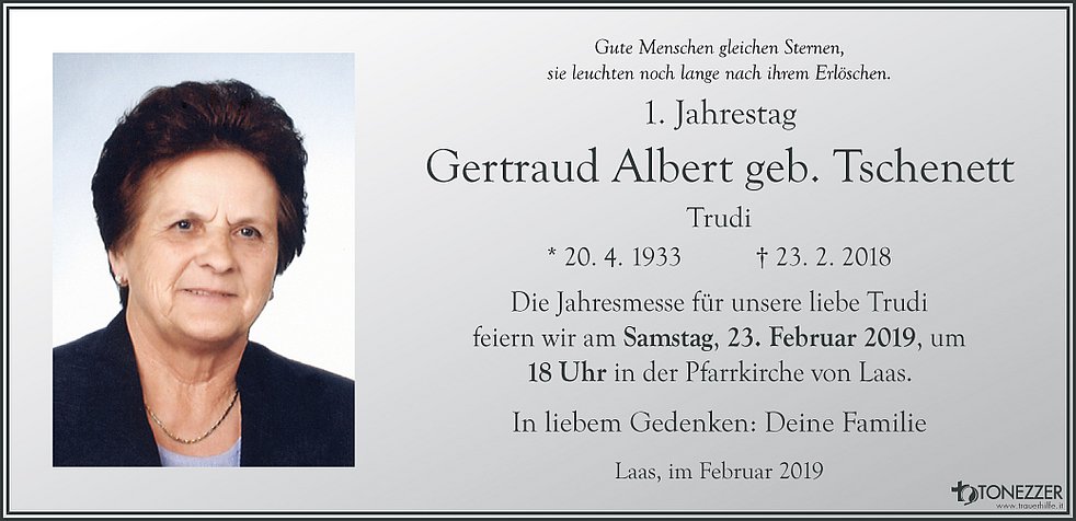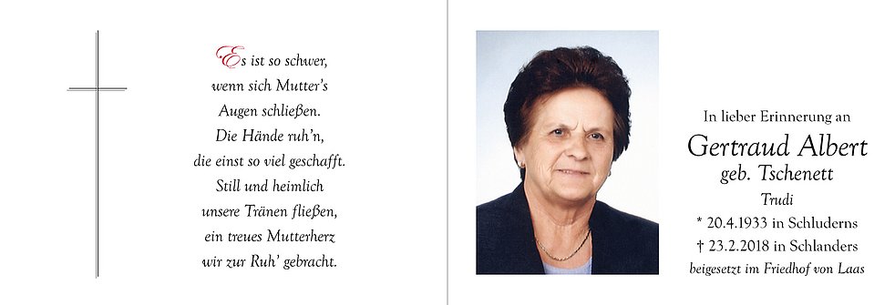 Den Trauergottesdienst für unsere liebe Verstorbene feiern wir am Dienstag, 27. Februar, um 14 Uhr in der Pfarrkirche von Laas.
