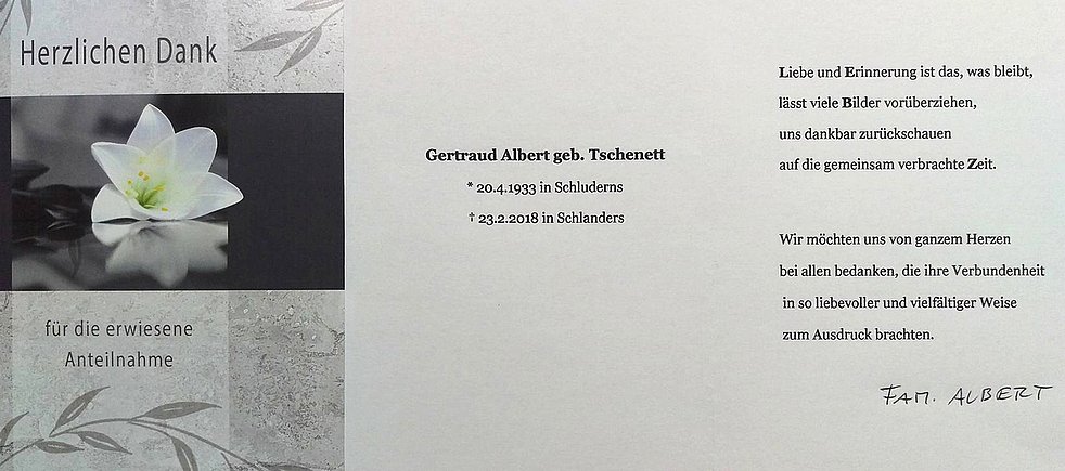Unser besonderer Dank gilt ihrem Sohn Andreas für die lange, liebevolle und fürsorgliche Betreuung und Pflege, dem Hauspflegedienst Mittelvinschgau, sowie dem gesamten Team der zentralen Überwachungsstation des Krankenhauses von Schlanders.