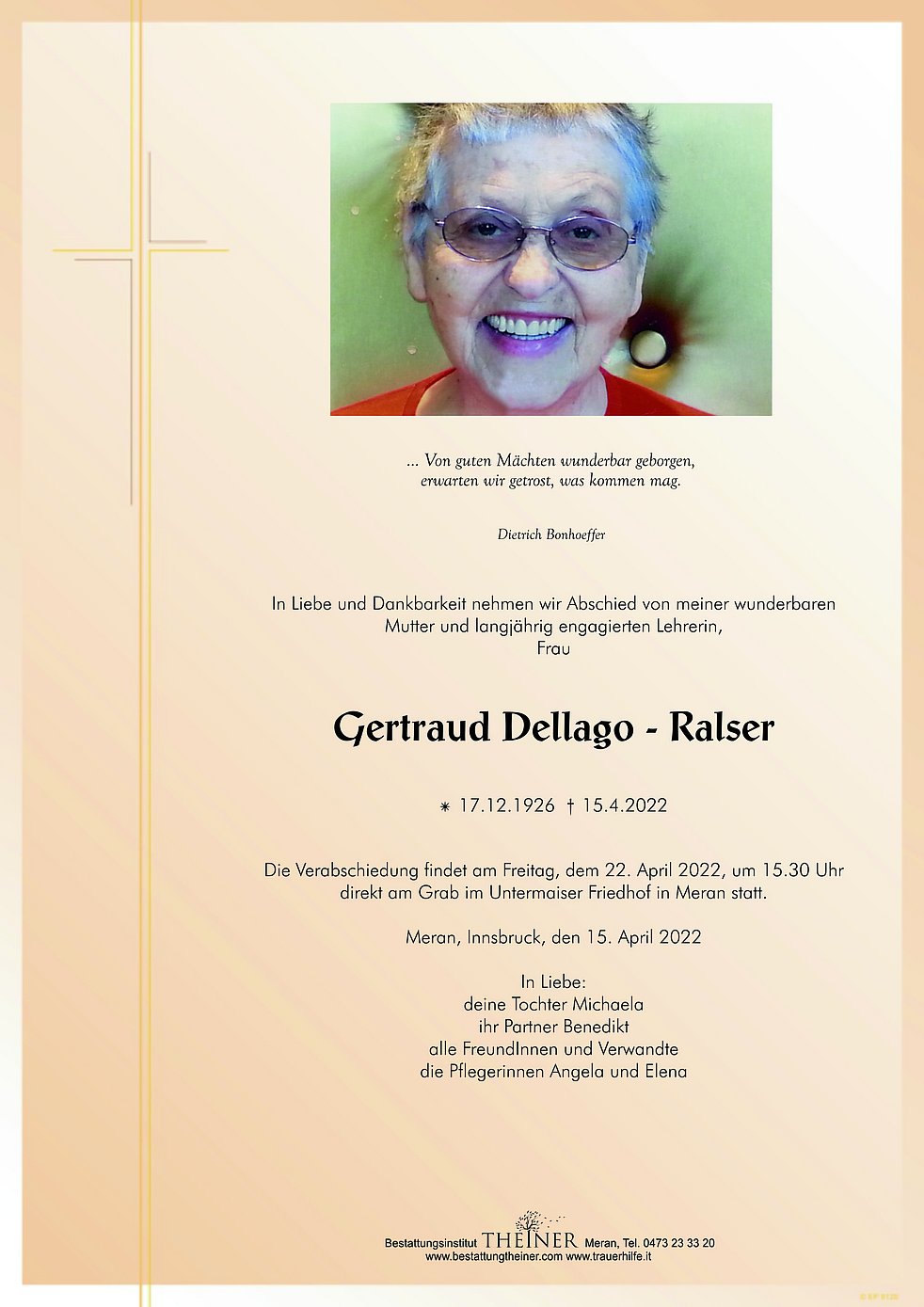 Die Verabschiedung findet am Freitag, dem 22. April 2022, um 15.30 Uhr direkt am Grab im Untermaiser Friedhof in Meran statt.
