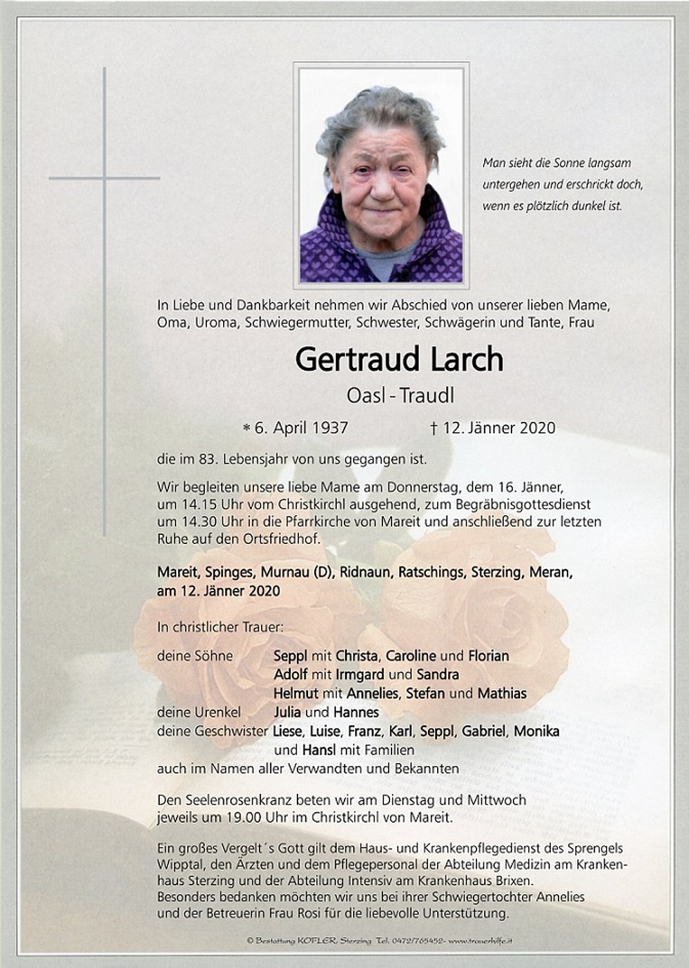 Ein großes Vergelt´s Gott gilt dem Haus- und Krankenpflegedienst des Sprengels Wipptal, den Ärzten und dem Pflegepersonal der Abteilung Medizin am Krankenhaus Sterzing und der Abteilung Intensiv am Krankenhaus Brixen. Besonders bedanken möchten wir uns bei ihrer Schwiegertochter Annelies und der Betreuerin Frau Rosi für die liebevolle Unterstützung.