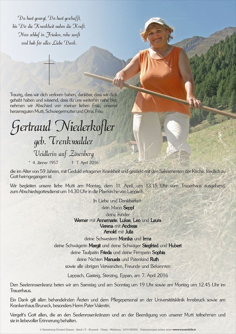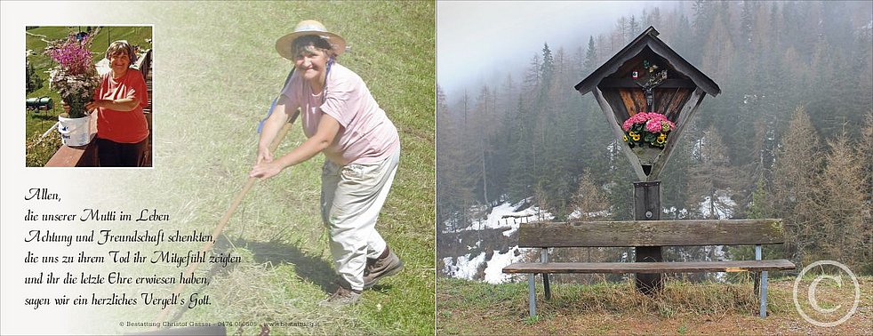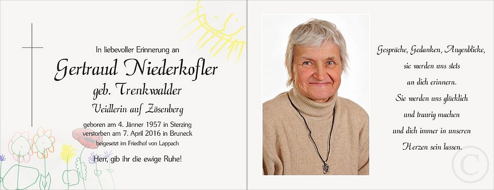 Wir begleiten unsere liebe Mutti am Montag, dem 11. April, um 13.15 Uhr vom Trauerhaus ausgehend, zum Abschiedsgottesdienst um 14.30 Uhr in die Pfarrkirche von Lappach.