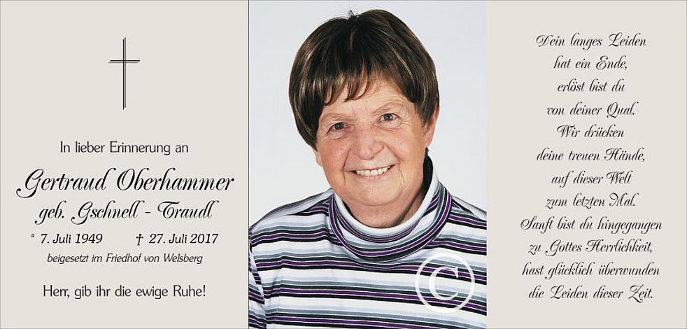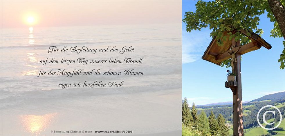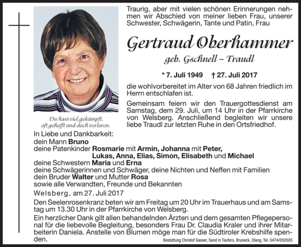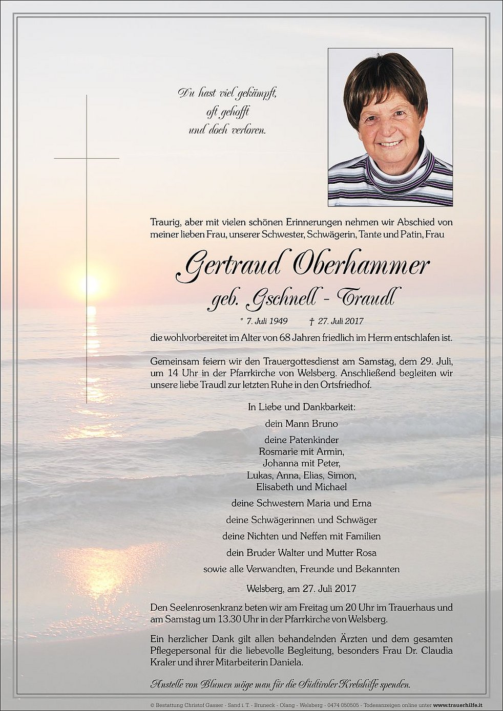 Gemeinsam feiern wir den Trauergottesdienst am Samstag, dem 29. Juli, um 14 Uhr in der Pfarrkirche von Welsberg. Anschließend begleiten wir unsere liebe Traudl zur letzten Ruhe in den Ortsfriedhof.