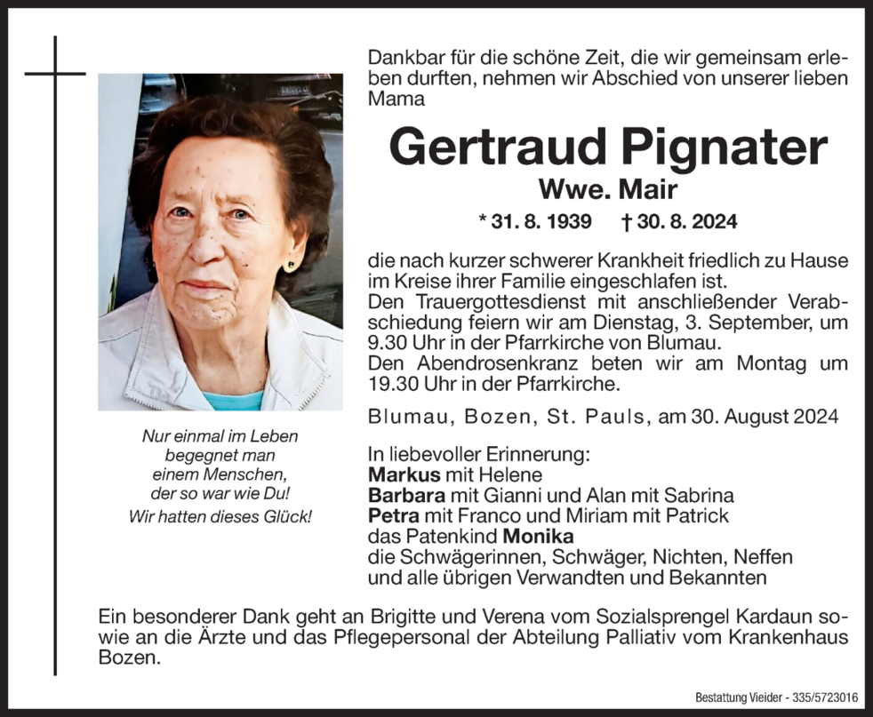 Den Trauergottesdienst mit anschließender Verabschiedung feiern wir am Dienstag, 3. September, um 9.30 Uhr in der Pfarrkirche von Blumau.
