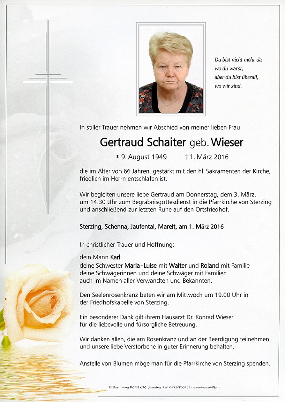 Anstelle von Blumen möge man für die Pfarrkirche von Sterzing spenden.