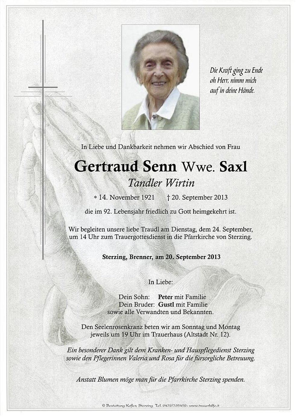 Anstatt Blumen möge man für die Pfarrkirche Sterzing spenden.