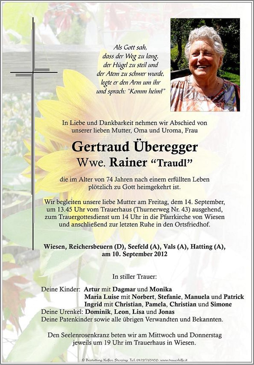 vom Trauerhaus (Thurnerweg Nr. 43) ausgehend,zum Trauergottesdienst um 14 Uhr