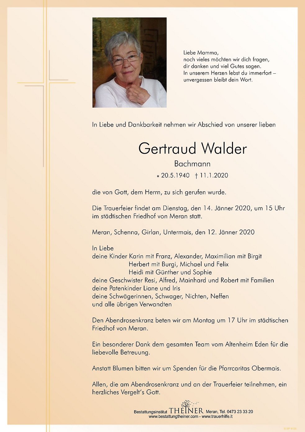 Die Trauerfeier findet am Dienstag, den 14. Jänner 2020, um 15 Uhr im städtischen Friedhof von Meran statt.
