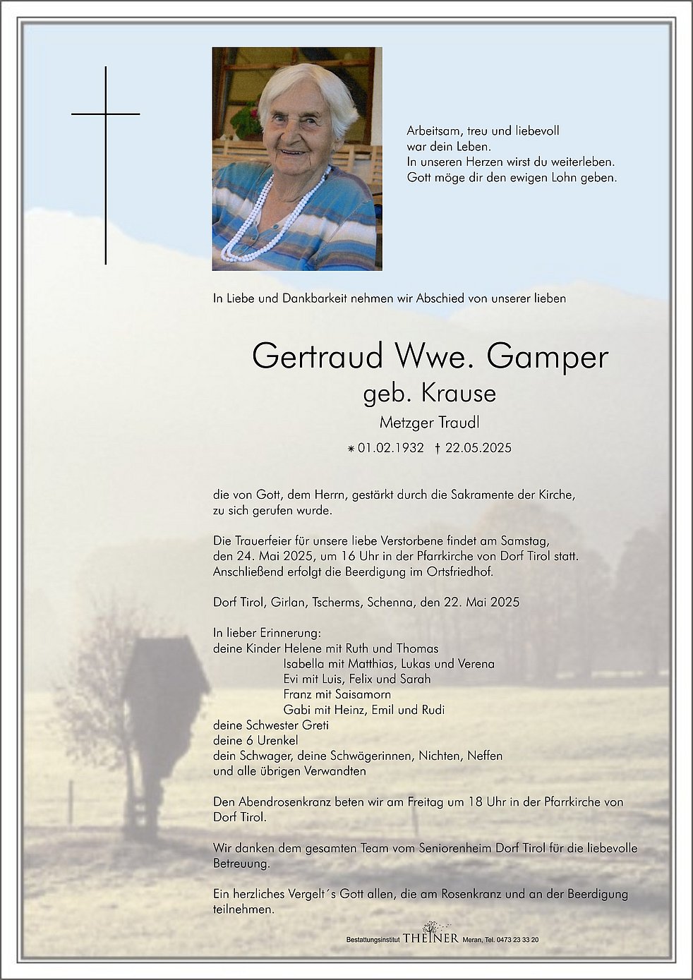 Die Trauerfeier für unsere liebe Verstorbene findet am Samstag, den 24. Mai 2025, um 16 Uhr in der Pfarrkirche von Dorf Tirol statt. Anschließend erfolgt die Beerdigung im Ortsfriedhof.