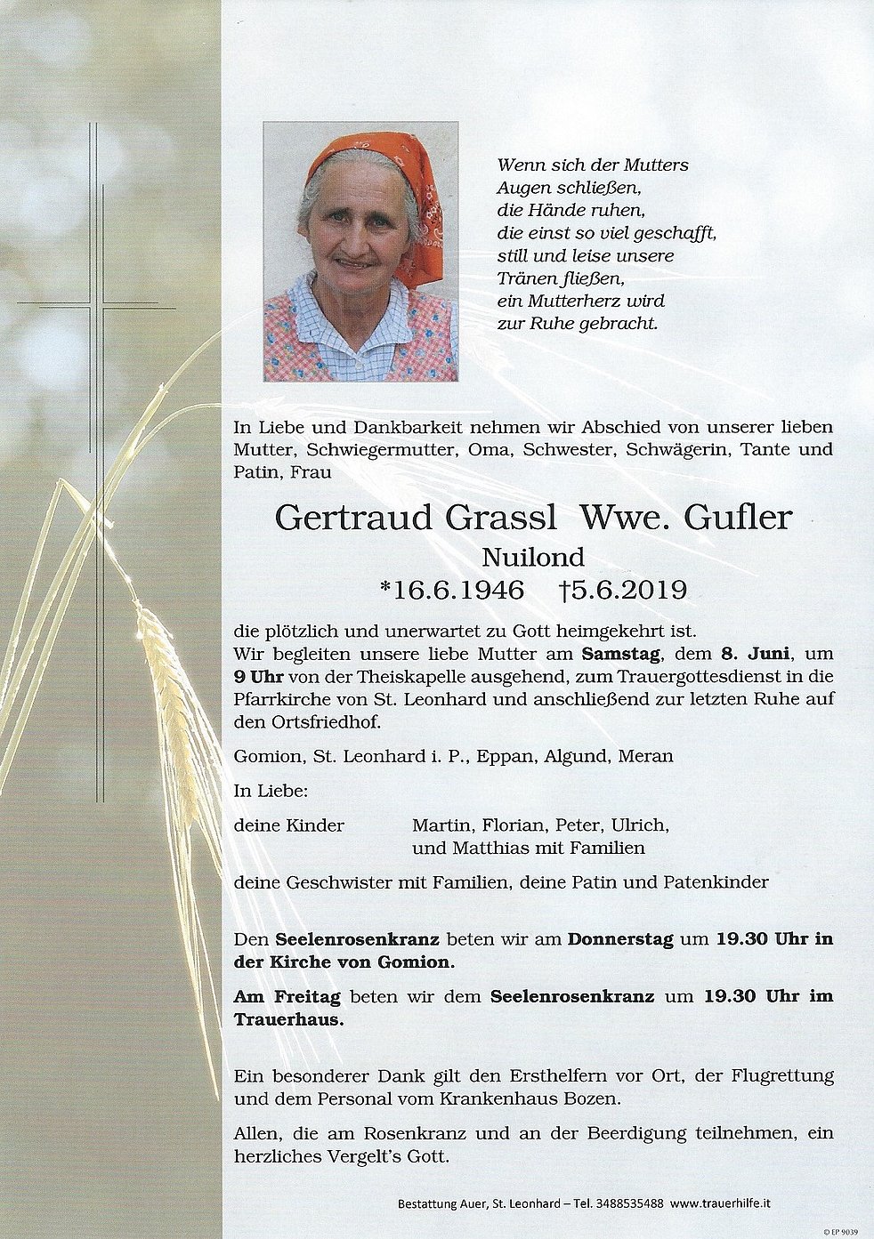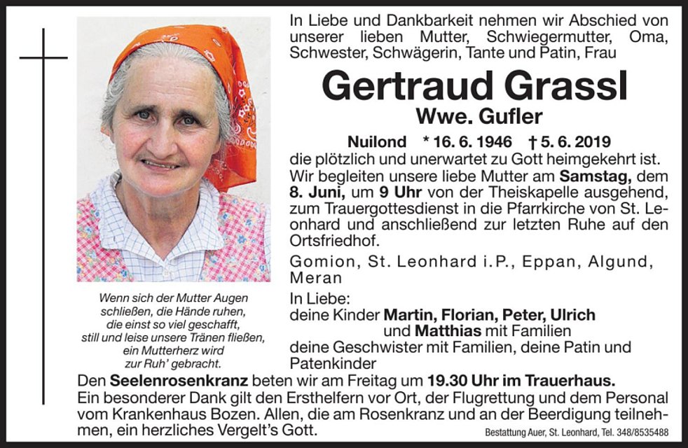 Wir begleiten unsere liebe Mutter am Samstag, dem 8. Juni, um 9 Uhr von der Theiskapelle ausgehend, zum Trauergottesdienst in die Pfarrkirche von St. Leonhard und anschließend zur letzten Ruhe auf den Ortsfriedhof.