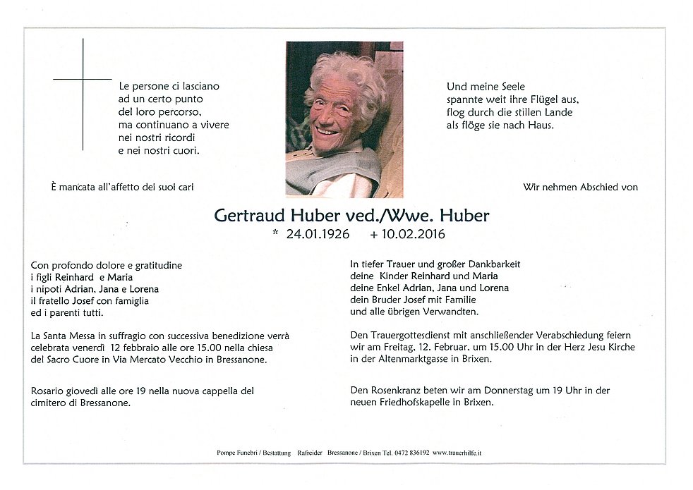 Gedankt sei dem Hausarzt Dr. Walter Niederstätter, den Ärzten und dem Pflegepersonal der Abteilung Medizin Süd des Brixner Krankenhauses für die liebevolle Betreuung und allen die am Rosenkranz und an der Verabschiedung teilnehmen.