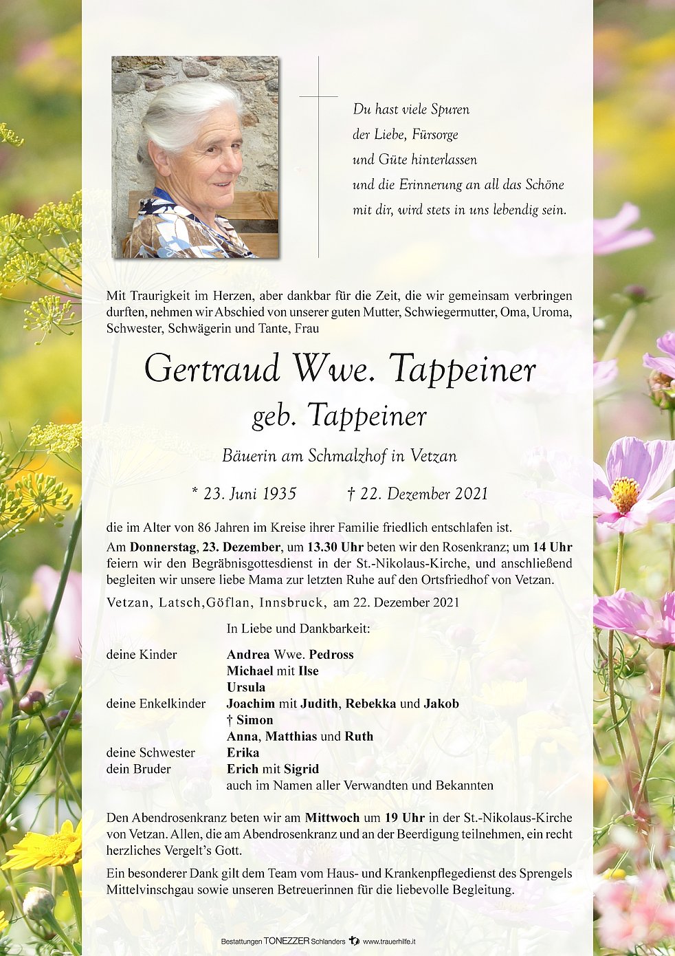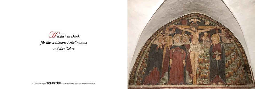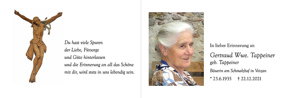 Am Donnerstag, 23. Dezember, um 13.30 Uhr beten wir den Rosenkranz; um 14 Uhr feiern wir den Begräbnisgottesdienst in der St.-Nikolaus-Kirche, und anschließend begleiten wir unsere liebe Mama zur letzten Ruhe auf den Ortsfriedhof von Vetzan.