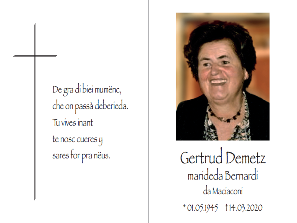 Ein besonderer Dank gilt dem Hauspflegedienst, den Hausärzten und dem Pflegepersonal des Altersheimes San Durich für die liebevolle Betreuung.