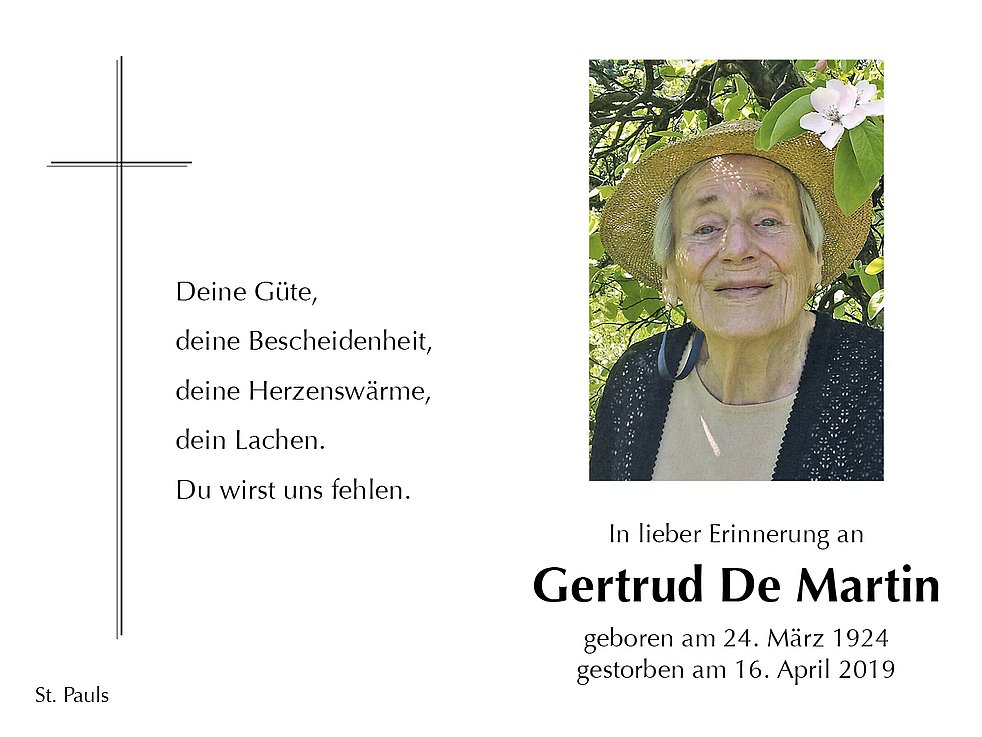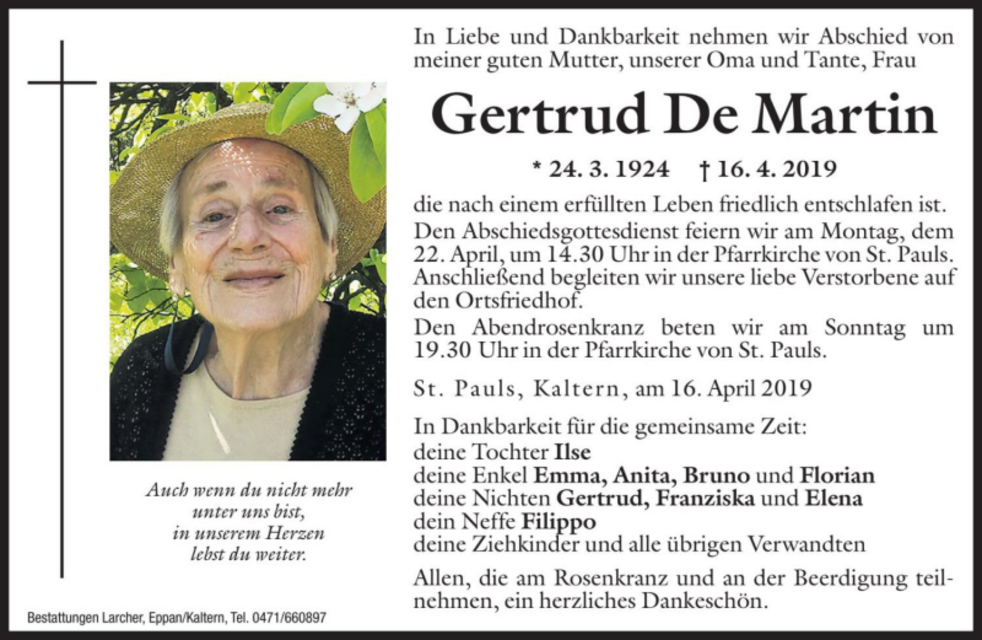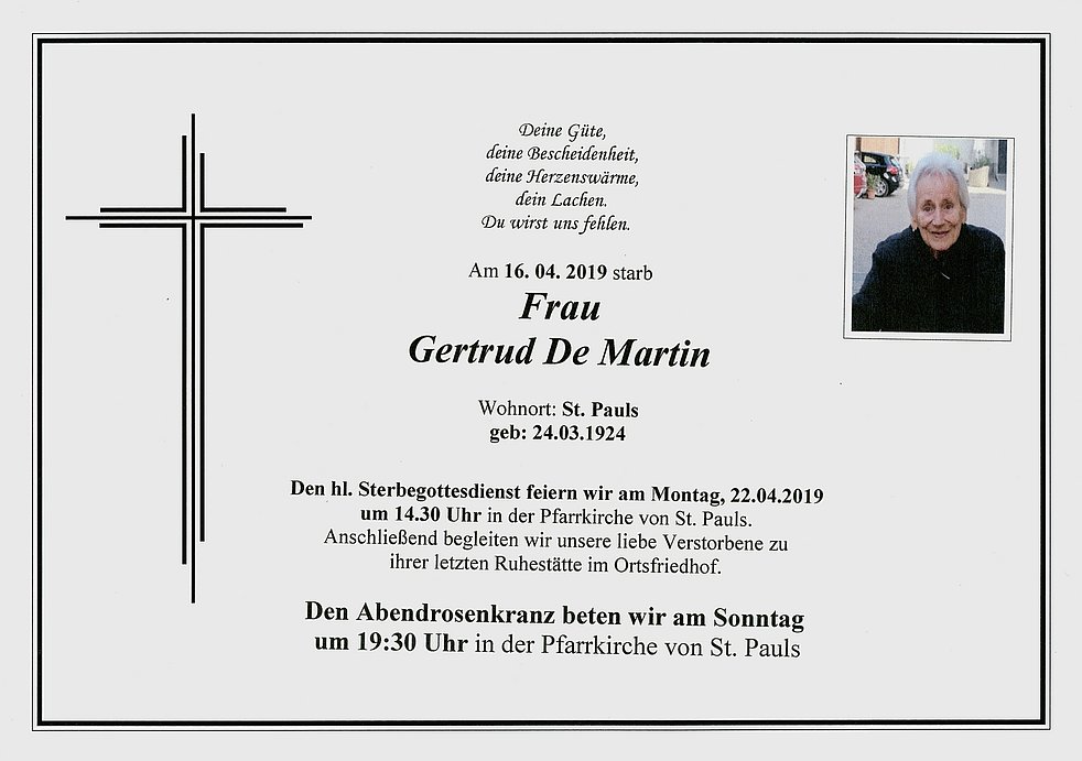 Den Abschiedsgottesdienst feiern wir am Montag, dem 22. April um 14.30 Uhr in der Pfarrkirche von St. Pauls. Anschließend begleiten wir unsere liebe Verstorbene auf den Ortsfriedhof.