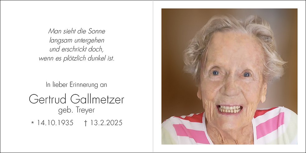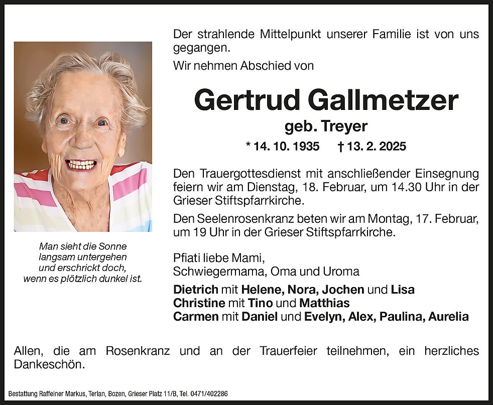 Den Trauergottesdienst mit anschließender Einsegnung feiern wir am Dienstag, 18. Februar, um 14.30 Uhr in der Grieser Stiftspfarrkirche.