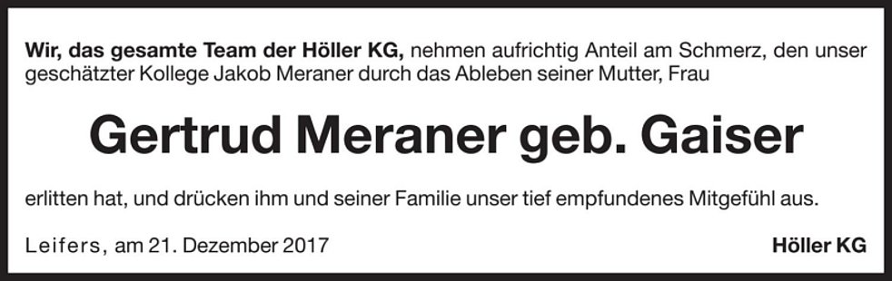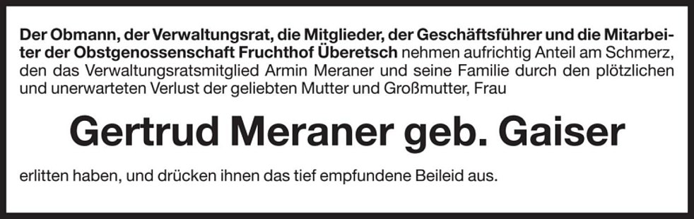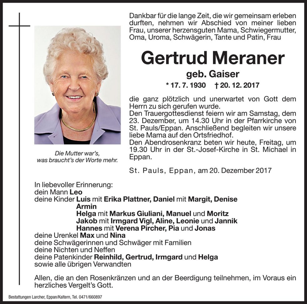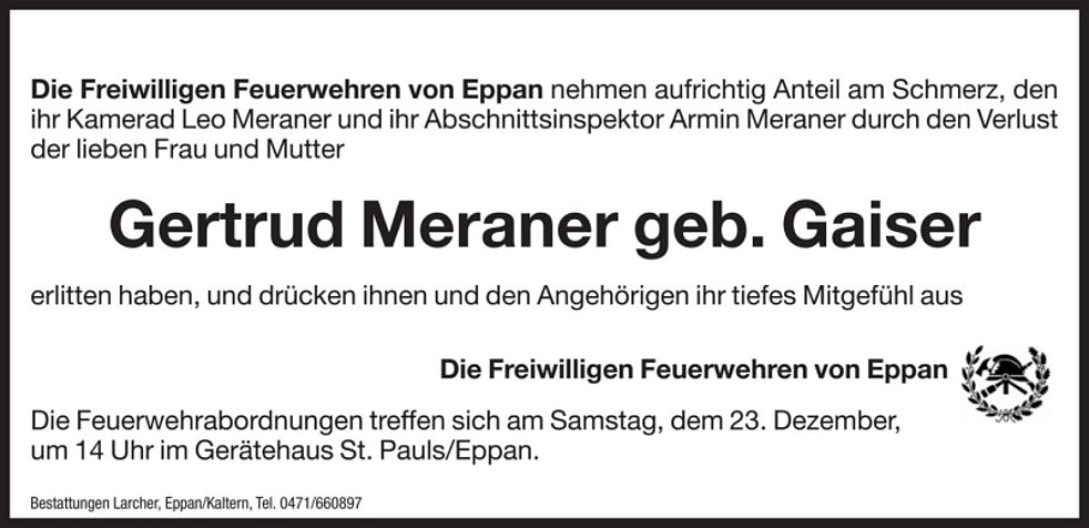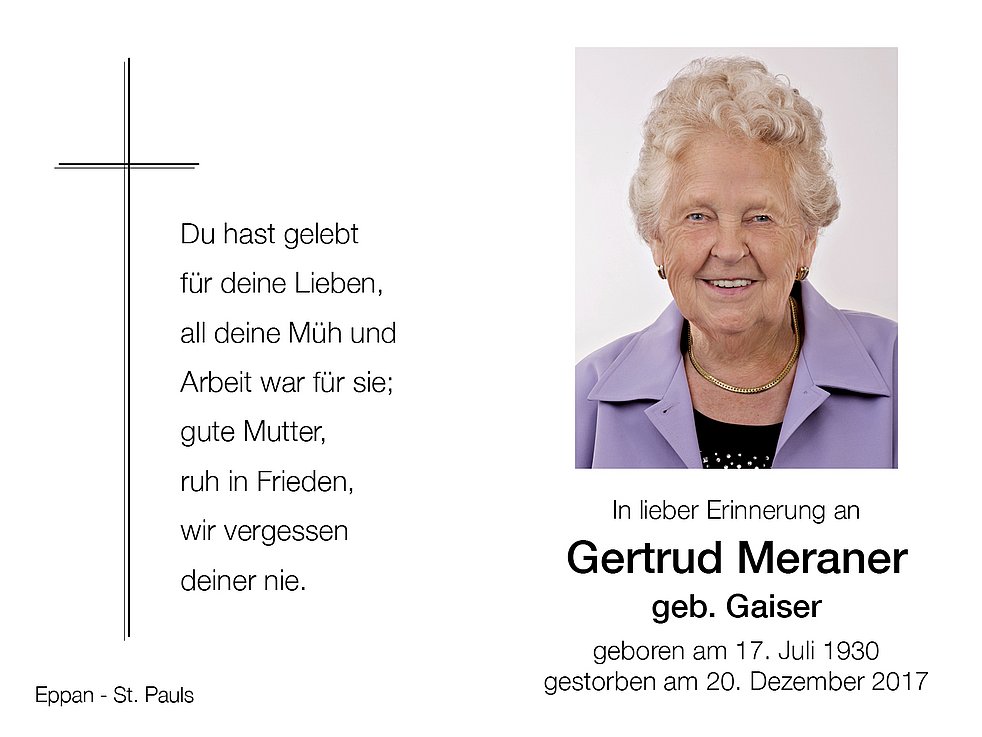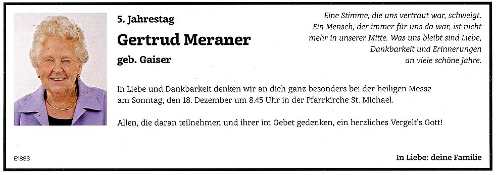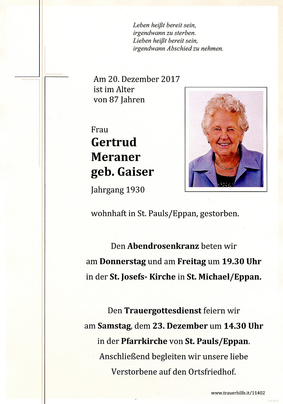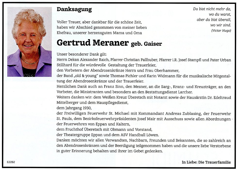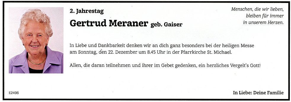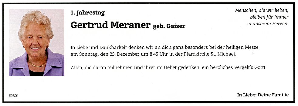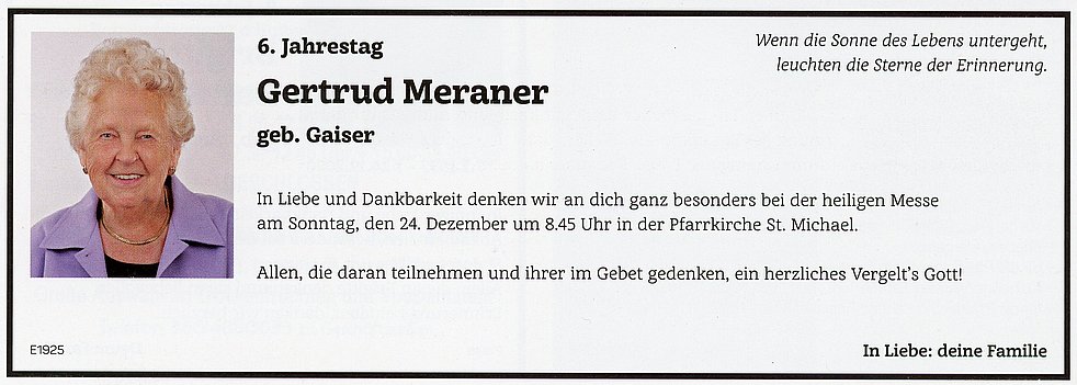 Den Trauergottesdienst feiern wir am Samstag, dem 23. Dezember um 14.30 Uhr in der Pfarrkirche von St. Pauls/Eppan. Anschließend begleiten wir unsere liebe Mama auf den Ortsfriedhof.