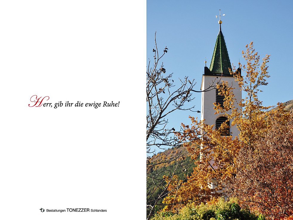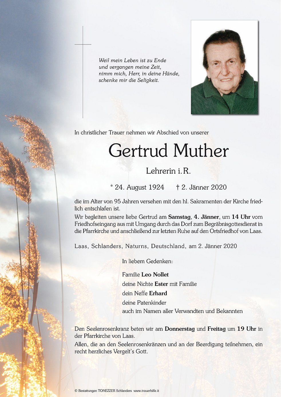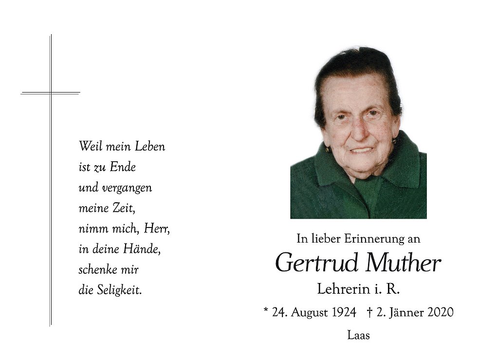 Wir begleiten unsere liebe Gertrud am Samstag, 4. Jänner, um 14 Uhr vom Friedhofseingang aus mit Umgang durch das Dorf zum Begräbnisgottesdienst in die Pfarrkirche und anschließend zur letzten Ruhe auf den Ortsfriedhof von Laas.