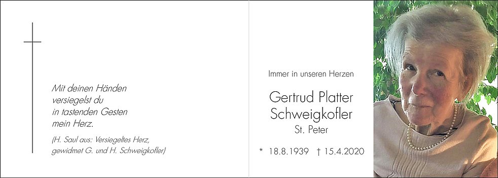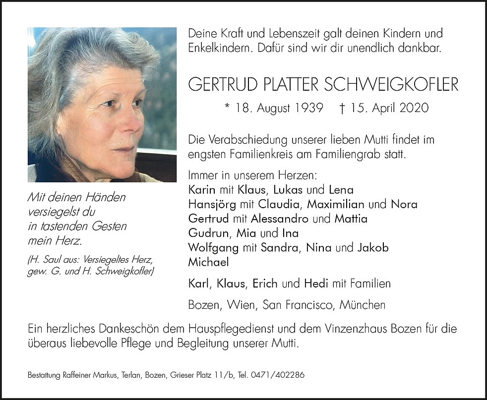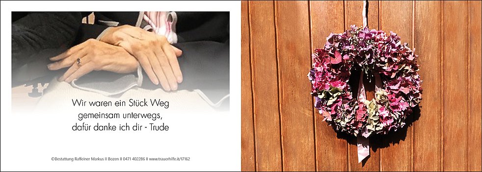 Ein herzliches Dankeschön dem Hauspflegedienst und dem Vinzenzhaus Bozen für die überaus liebevolle Pflege und Begleitung unserer Mutti.