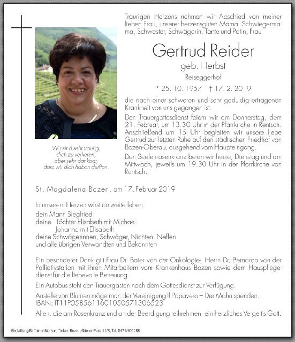 Den Trauergottesdienst feiern wir am Donnerstag, dem 21. Februar, um 13.30 Uhr in der Pfarrkirche in Rentsch. Anschlieβend um 15 Uhr begleiten wir unsere liebe Gertrud zur letzten Ruhe auf den städtischen Friedhof von Bozen-Oberau, ausgehend vom Haupteingang.