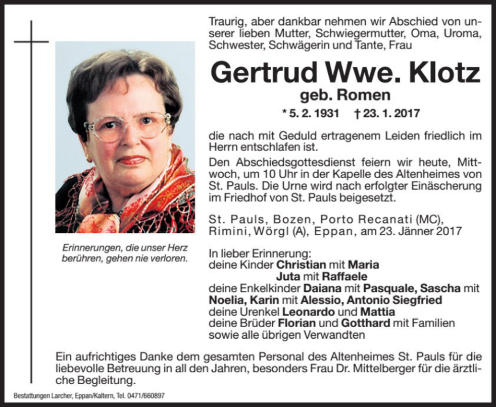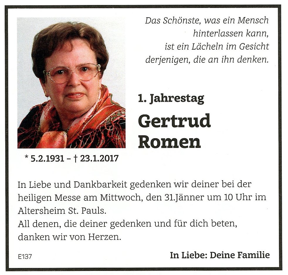 Ein aufrichtiges Danke dem gesamten Personal des Altenheimes St. Pauls für die liebevolle Betreuung in all den Jahren, besonders Frau Dr. Mittelberger für die ärztliche Begleitung.