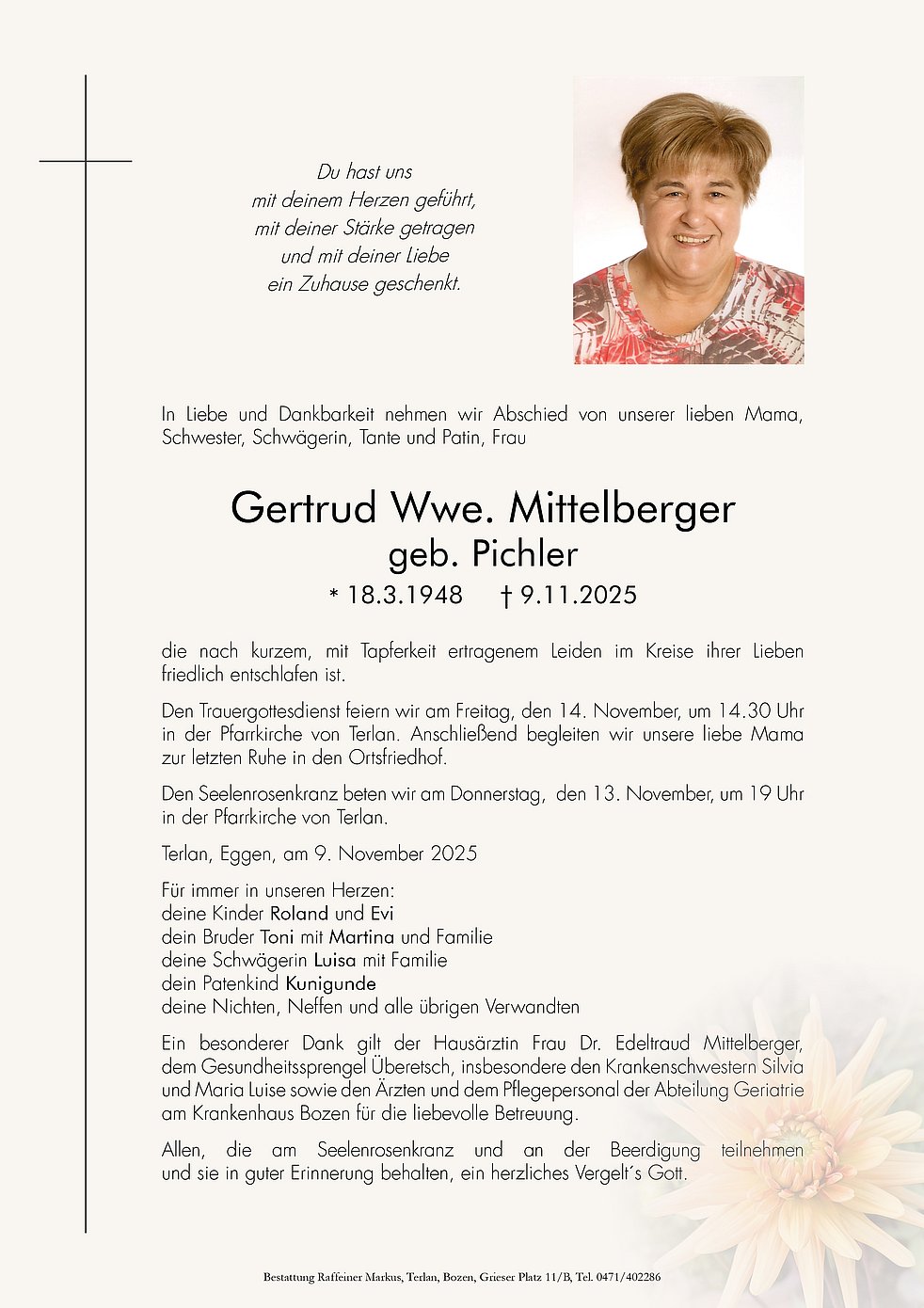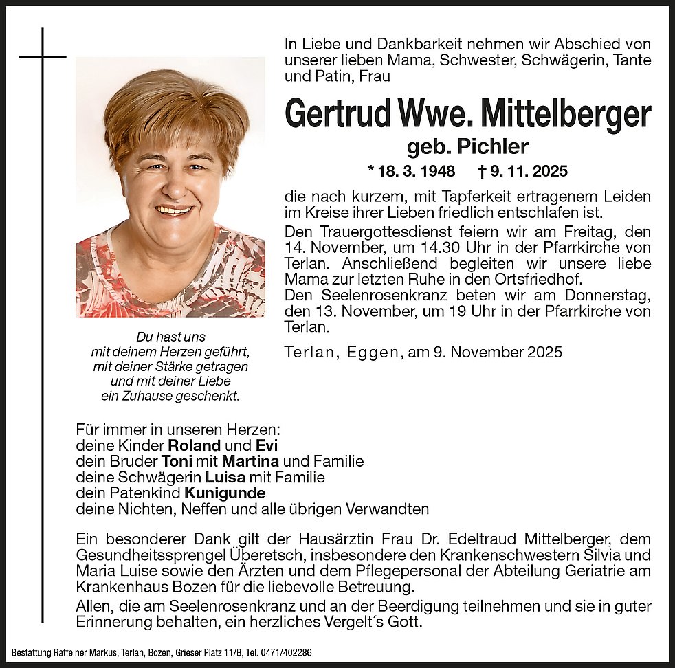 Den Trauergottesdienst feiern wir am Freitag, den 14. November, um 14.30 Uhr in der Pfarrkirche von Terlan. Anschließend begleiten wir unsere liebe Mama zur letzten Ruhe in den Ortsfriedhof.