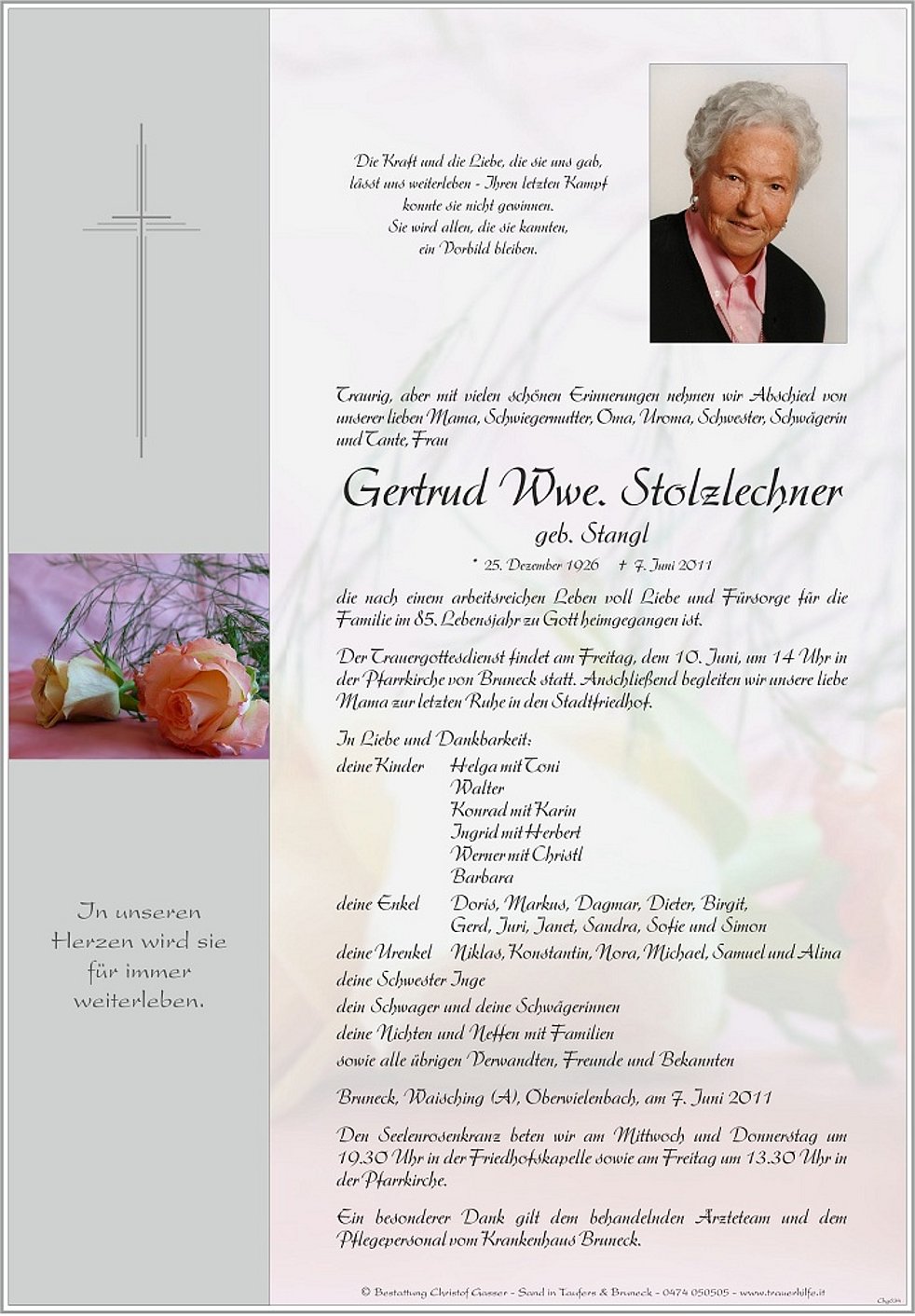 Der Trauergottesdienst findet am Freitag, dem 10. Juni, um 14 Uhr in der Pfarrkirche von Bruneck statt. Anschließend begleiten wir unsere liebe Mama zur letzten Ruhe in den Stadtfriedhof.