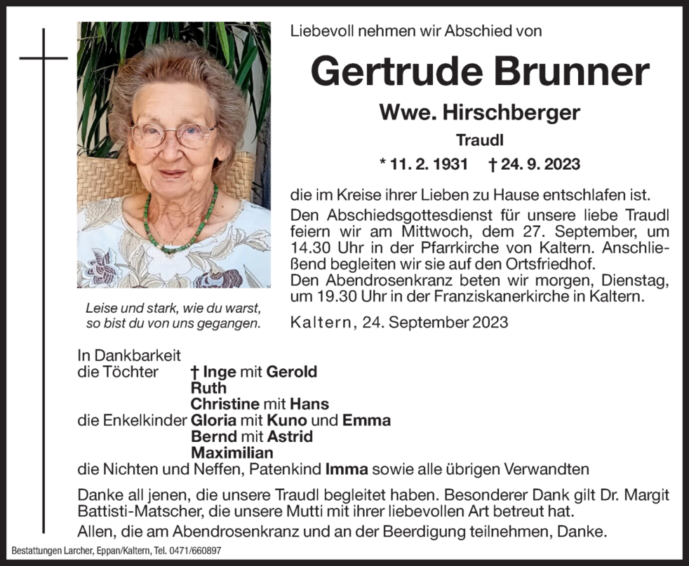 Den Abschiedsgottesdienst unserer lieben Traudl feiern wir am Mittwoch, dem 27. September um 14.30 Uhr in der Pfarrkirche von Kaltern. Anschließend begleiten wir sie auf den Ortsfriedhof.