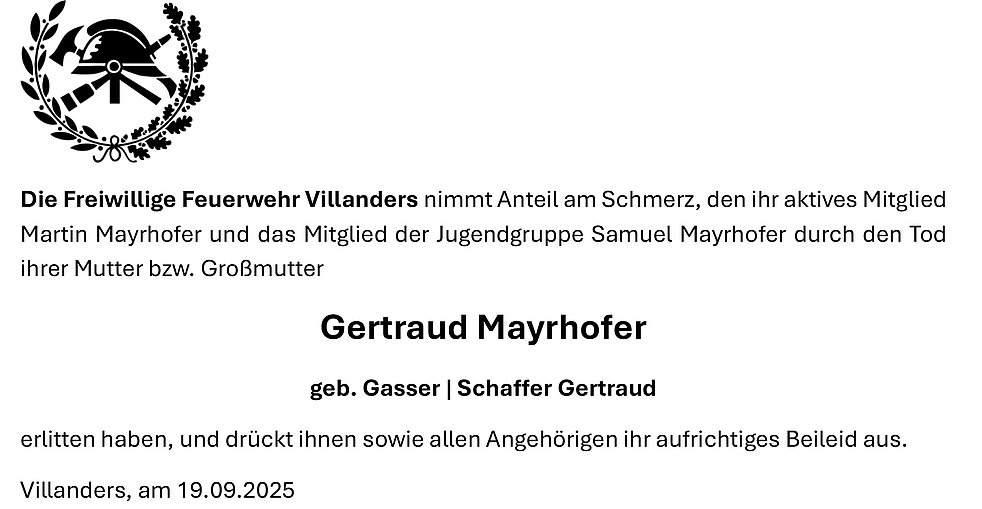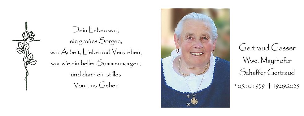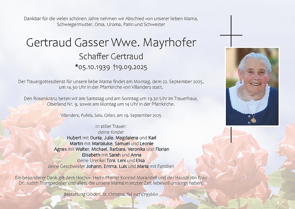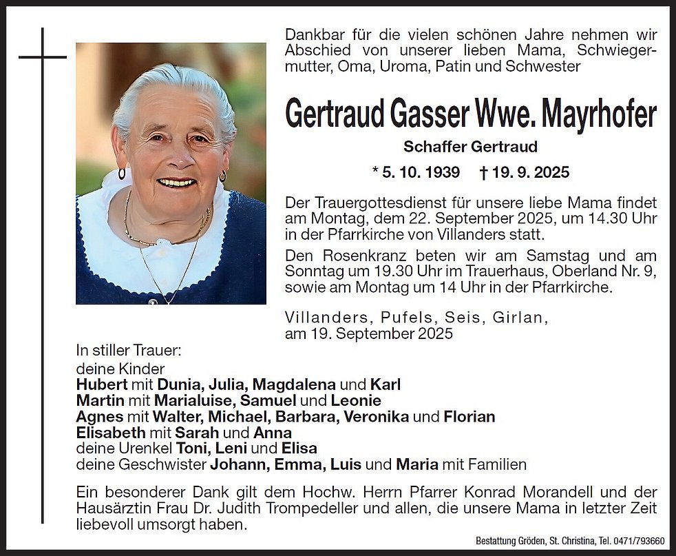 Der Trauergottesdienst für unsere liebe Mama findet am Montag, dem 22. September 2025, um 14.30 Uhr in der Pfarrkirche von Villanders statt.
