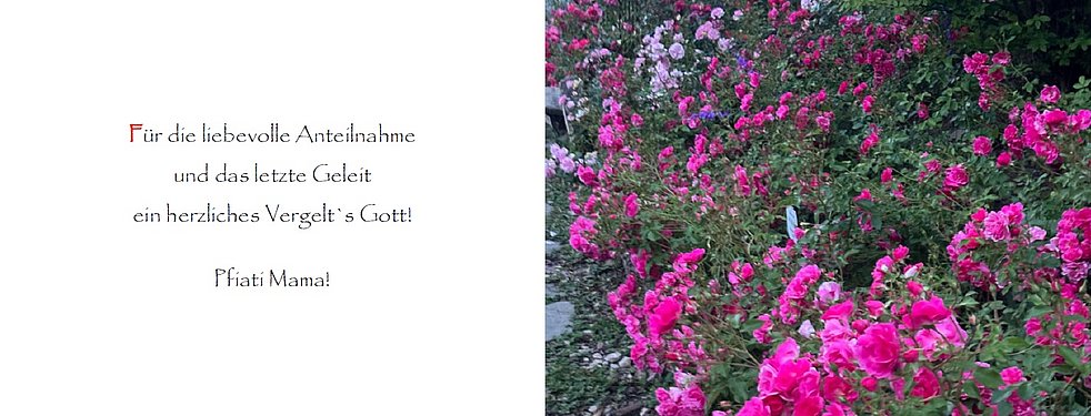 Ein besonderer Dank gilt dem Hochw. Herrn Pfarrer Konrad Morandell und der Hausärztin Frau Dr. Judith Trompedeller und allen, die unsere Mama in letzter Zeit liebevoll umsorgt haben.