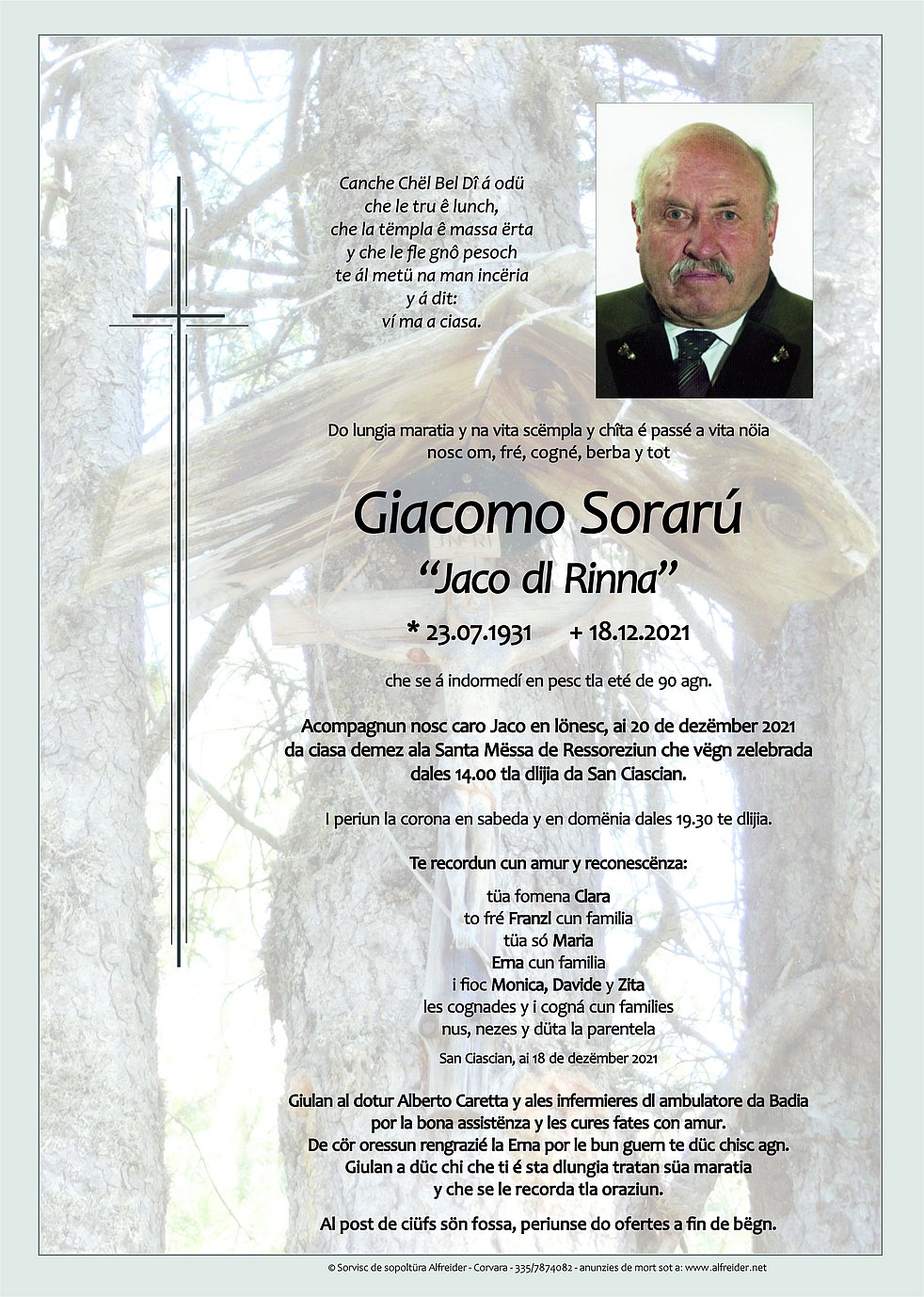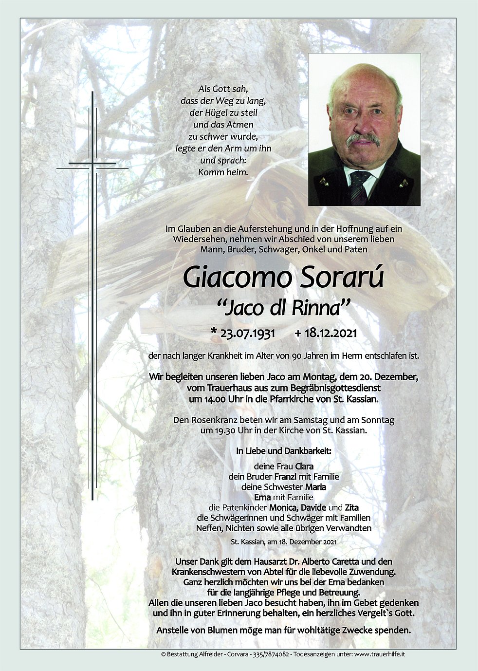 Wir begleiten unseren lieben Jaco am Montag, dem 20. Dezember, vom Trauerhaus aus zum Begräbnisgottesdienst um 14.00 Uhr in die Pfarrkirche von St. Kassian.