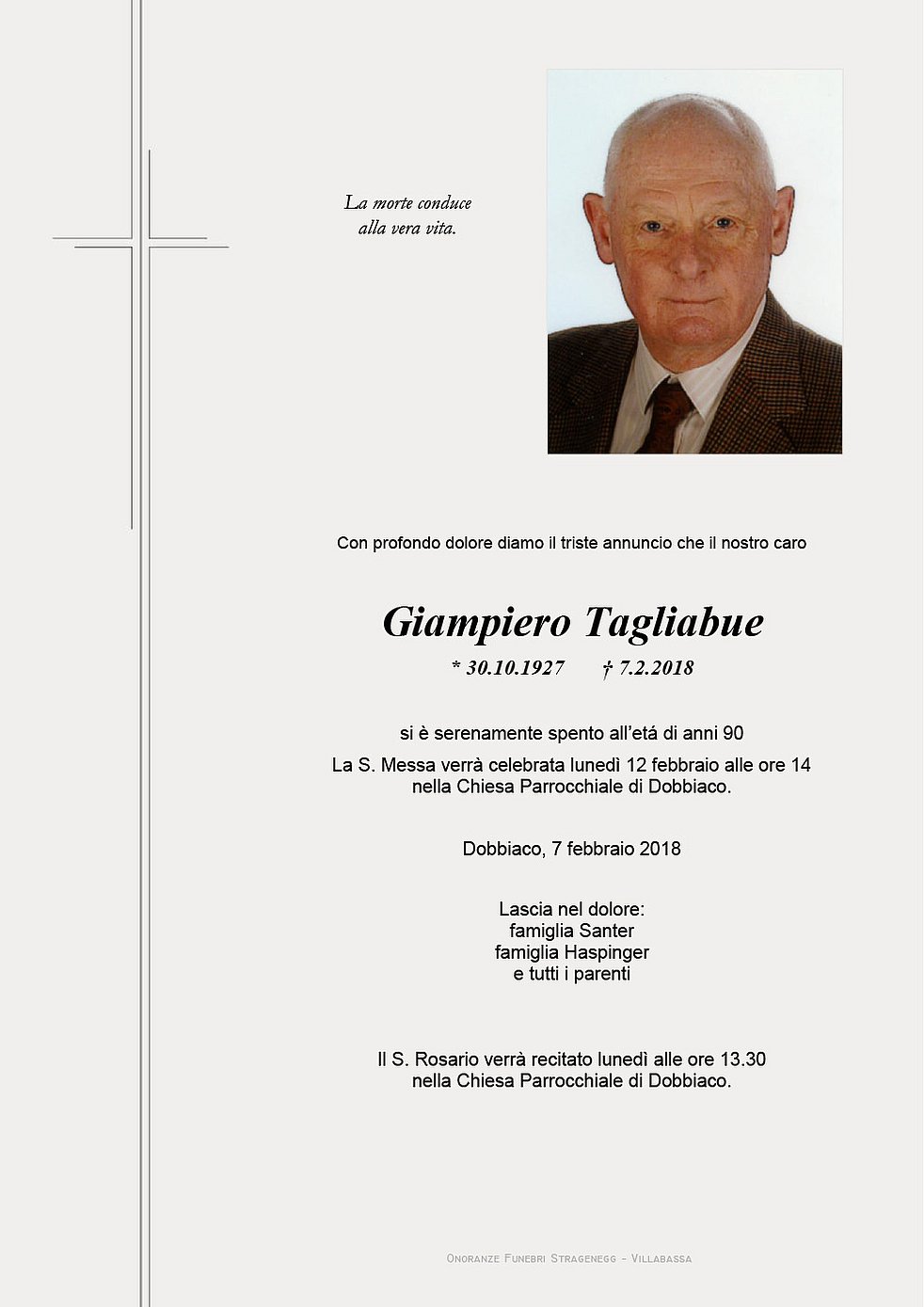 La S. Messa verrà celebrata lunedì 12 febbraio alle ore 14 nella Chiesa Parrocchiale di Dobbiaco.