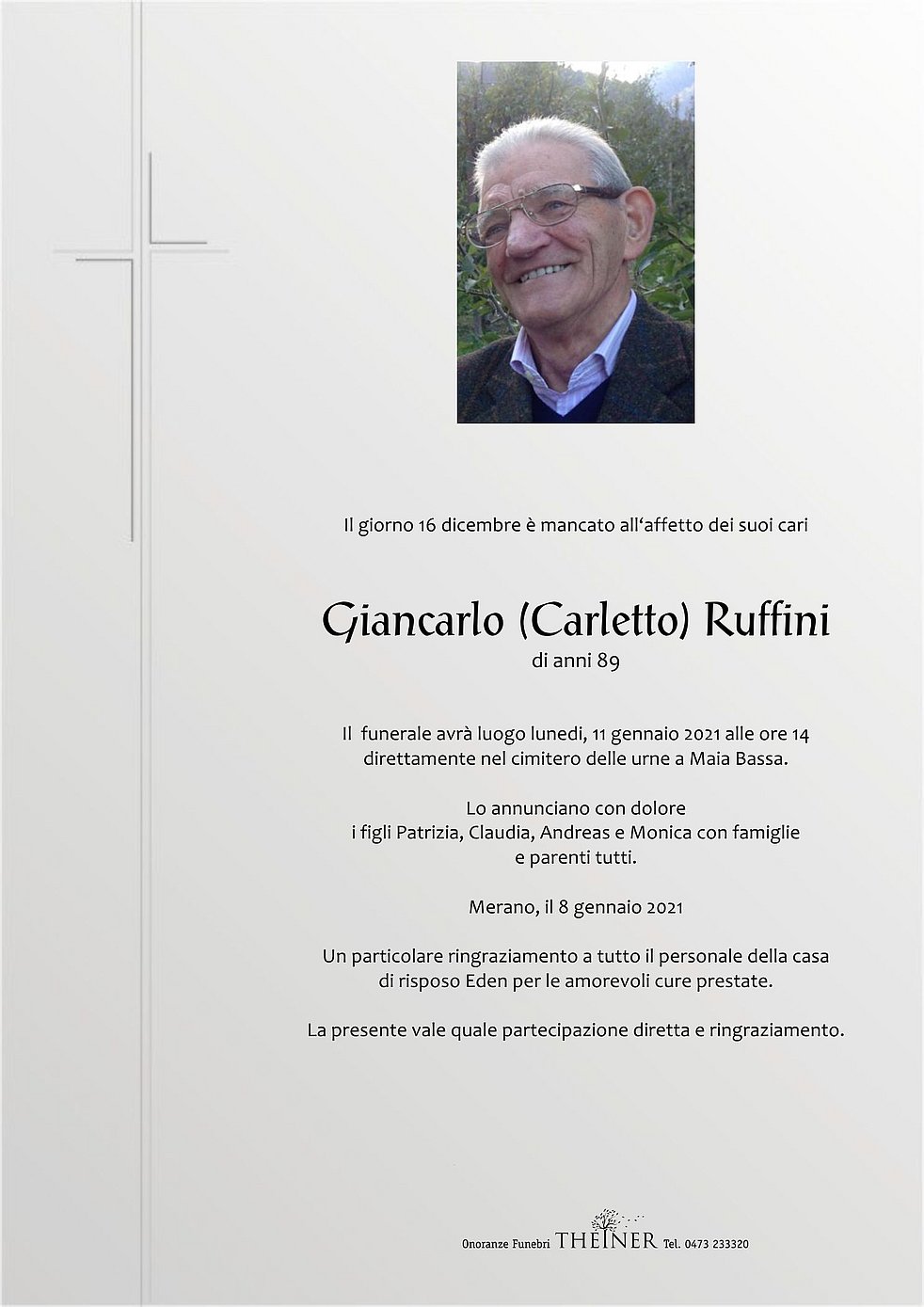 Il funerale avrà luogo lunedi, 11 gennaio 2021 alle ore 14 direttamente nel cimitero delle urne a Maia Bassa.
