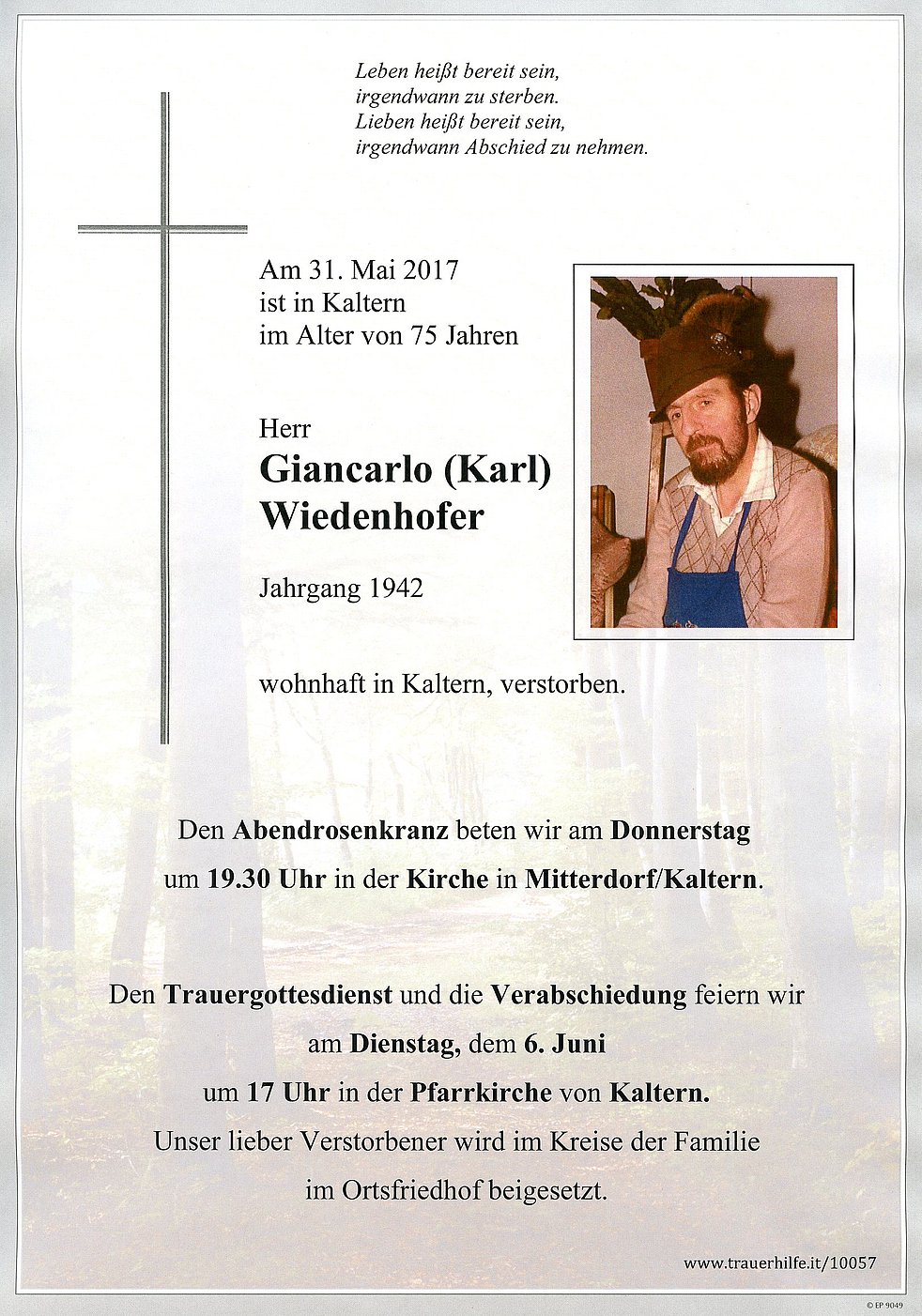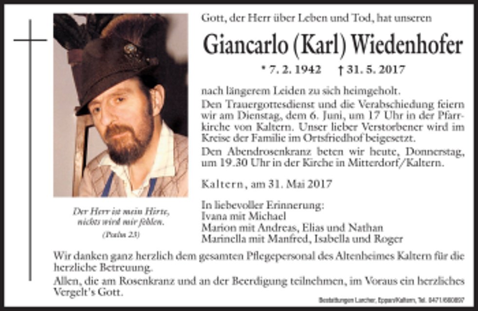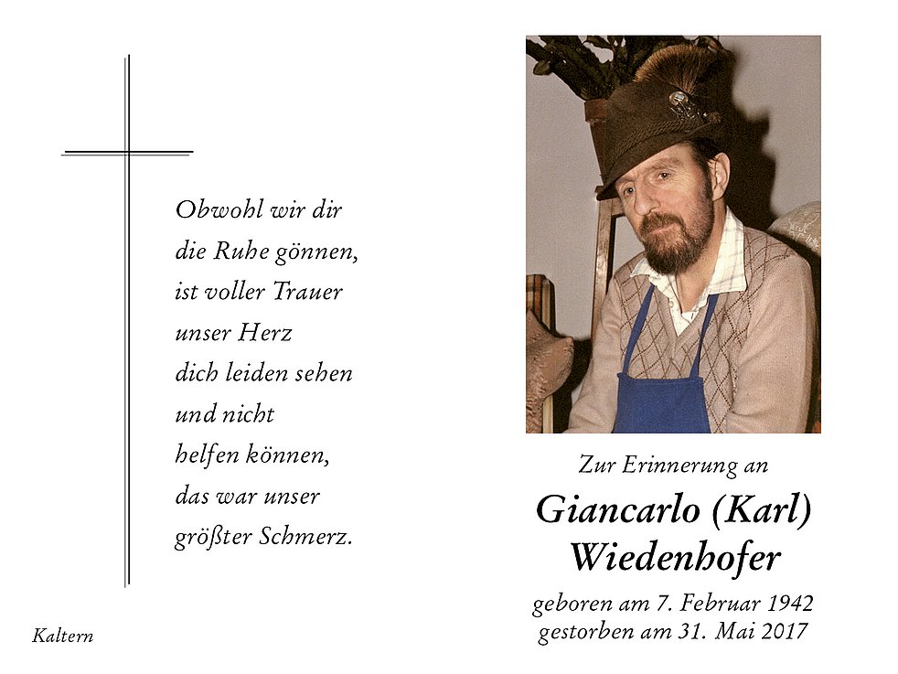 Den Trauergottesdienst und die Verabschiedung feiern wir am Dienstag, dem 6. Juni um 17 Uhr in der Pfarrkirche von Kaltern. Unser lieber Verstorbener wird im Kreise der Familie im Ortsfriedhof beigesetzt.