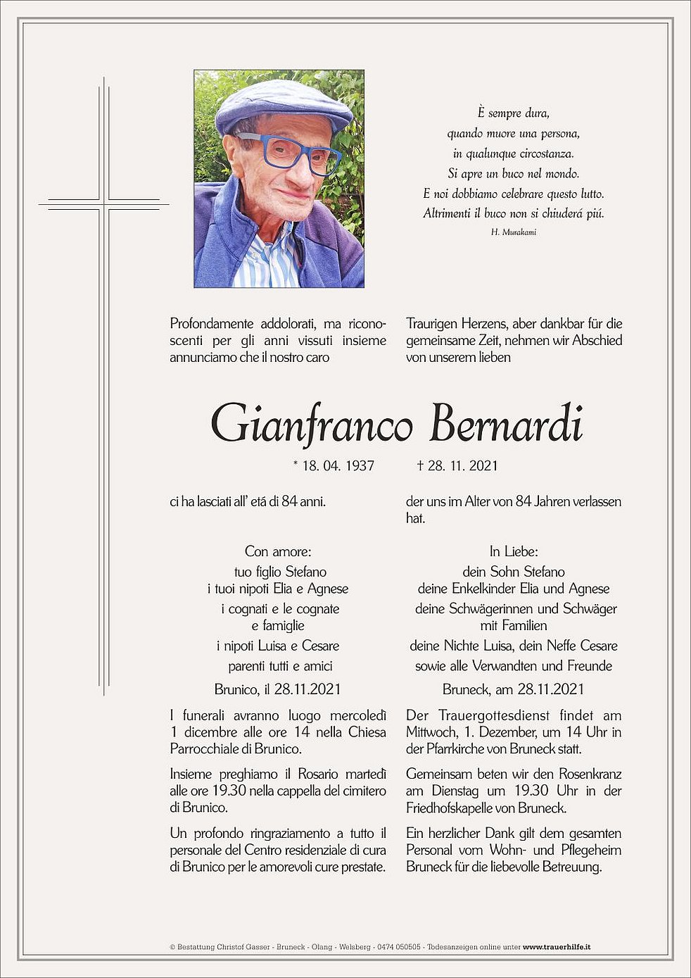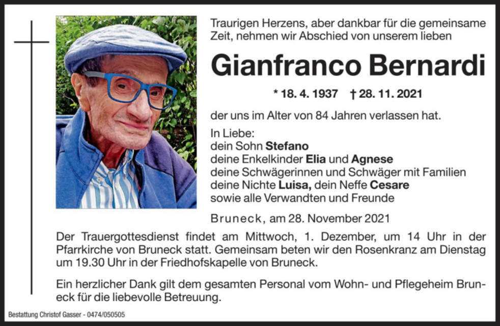 Der Trauergottesdienst findet am Mittwoch, 1. Dezember, um 14 Uhr in der Pfarrkirche von Bruneck statt.