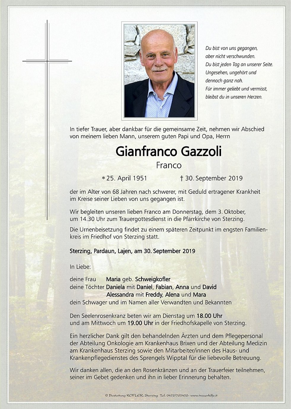 Wir begleiten unseren lieben Franco am Donnerstag, dem 3. Oktober, um 14.30 Uhr zum Trauergottesdienst in die Pfarrkirche von Sterzing.