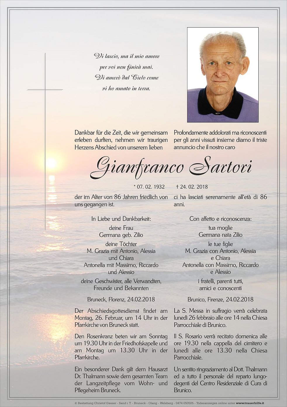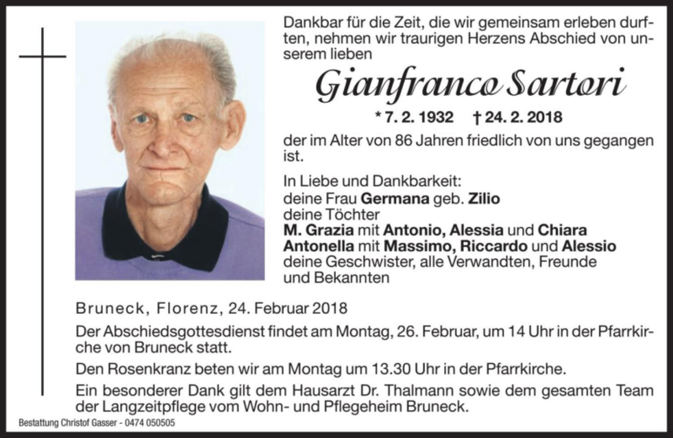 Der Abschiedsgottesdienst findet am Montag, 26. Februar, um 14 Uhr in der Pfarrkirche von Bruneck statt.